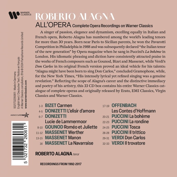 Ce coffret anniversaire rend hommage à la carrière illustre du grand Roberto Alagna, surnommé \"le ténor italien de la nouvelle génération\" par Opéra Magazine lors de sa performance de la Bohème de Puccini à Londres. Réputé pour son chant passionné, élégant et dynamique, Alagna excelle aussi bien dans l'opéra italien que dans l'opéra français, ce qui lui a valu une place parmi les plus grands ténors mondiaux depuis plus de trois décennies. \"Son chant intensément lyrique et raffi né a été une véritable révélation\", New York Times. Ce luxueux coffret tirage limité de 33 CD rassemble pour la première fois l'intégralité de ses enregistrements d'opéras complets, initialement publié par Erato, EMI Classics, Virgin Classics et Warner Classics (oeuvres de Bizet, Donizetti, Gounod, Massenet, Offenbach, Puccini, Verdi).