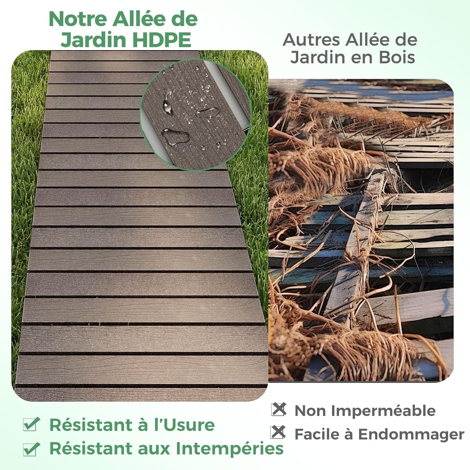 - Allée en HDPE de Qualité Supérieure : Contrairement aux allées traditionnelles en bois, cette allée extérieure est fabriquée en HDPE de haute qualité. Ce matériau est connu pour sa résistance à l'usure et sa résistance aux intempéries, ce qui fait de notre allée un choix parfait pour un usage extérieur tout au long de l'année.