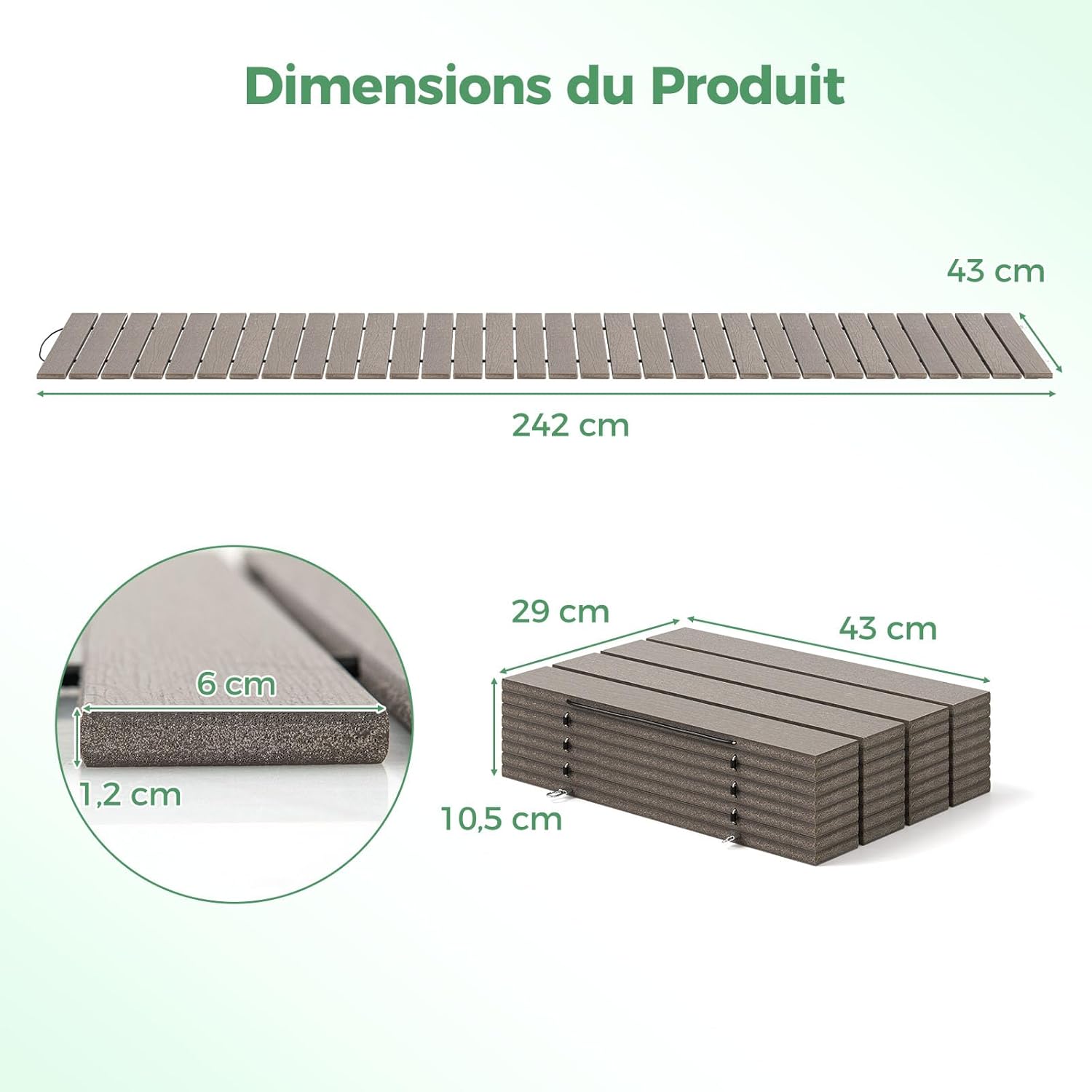 - Entretien Facile et Dimensions : Cette allée roulable nécessite un entretien minimal, il vous suffit de rincer la surface à l'eau propre pour la garder propre. D'une longueur de 242 cm et d'une largeur de 43 cm, cette planche pratique est l'ajout parfait à tout espace extérieur.