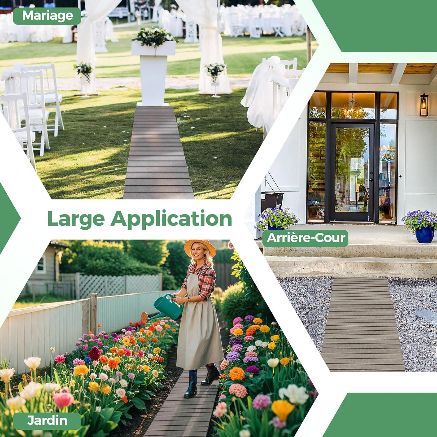 - Large Application : Cette allée droite de 242 cm offre suffisamment d'espace pour entretenir les plantes ou faire une promenade agréable, tout en gardant vos chaussures propres et sèches de la boue ou du sable. Elle est idéale pour les mariages, les rassemblements sur la plage ou pour créer un paysage charmant dans votre jardin.