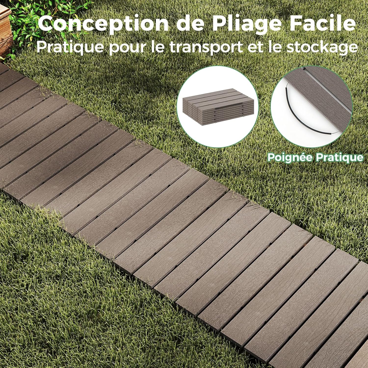- Conception Portable et Pliable : Cette allée décorative est composée de 32 lattes qui peuvent être repliées en une taille compacte lorsqu'elles ne sont pas utilisées, ce qui permet de gagner de l'espace de stockage. De plus, la poignée pratique facilite le transport de l'allée où vous voulez.