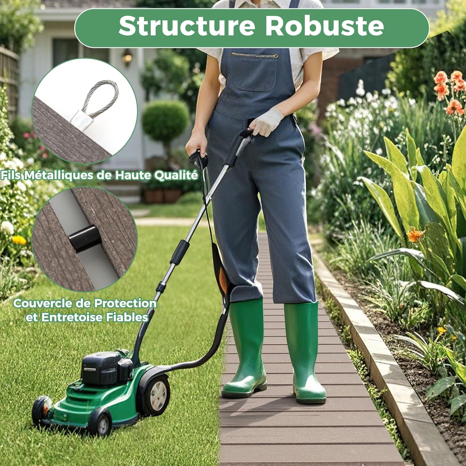 - Connexion Ferme et Stable : Chaque latte est reliée par 2 rangées de fils métalliques de qualité supérieure et des séparateurs ABS protecteurs, assurant une résistance au vieillissement et à l'usure. De plus, la structure robuste garantit que votre allée reste ferme et stable sous vos pieds.