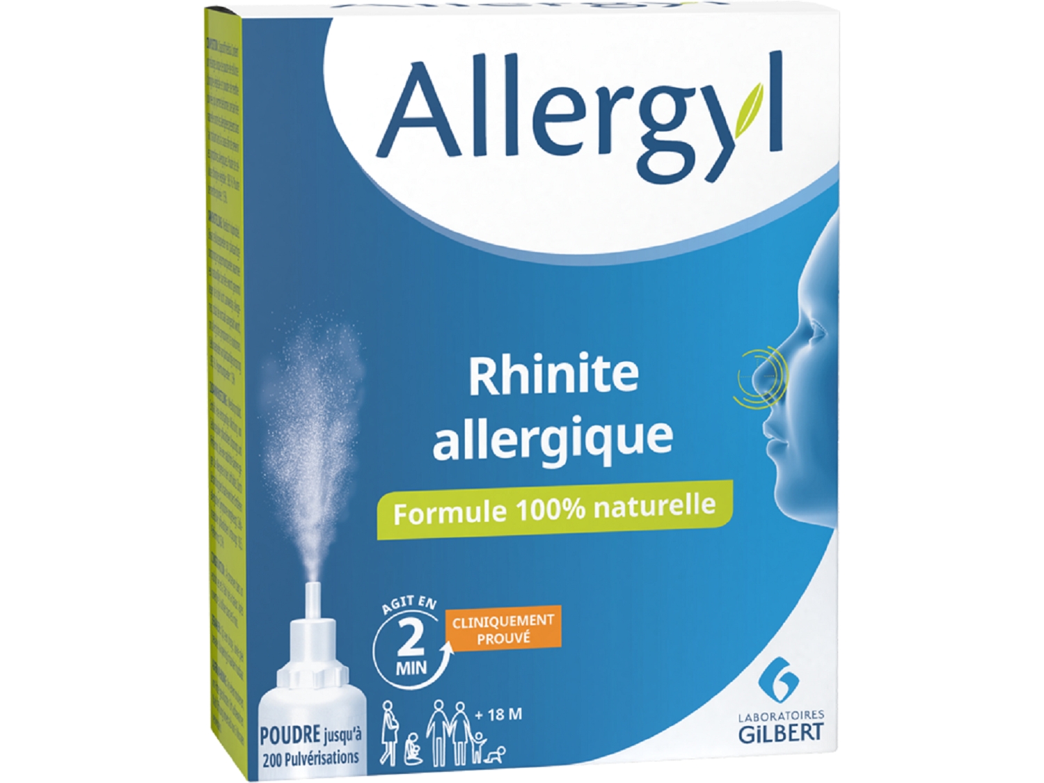 Gilbert Allergyl Spray Rhinite Allergique 800 mg est un dispositif médical cliniquement prouvé qui contient un mélange unique de poudre de cellulose d'origine végétale et de poudre de menthe poivrée, qui permet de former une barrière naturelle contre les allergènes présents dans l'air, traitant ainsi la cause afin de prévenir les symptômes allergiques.