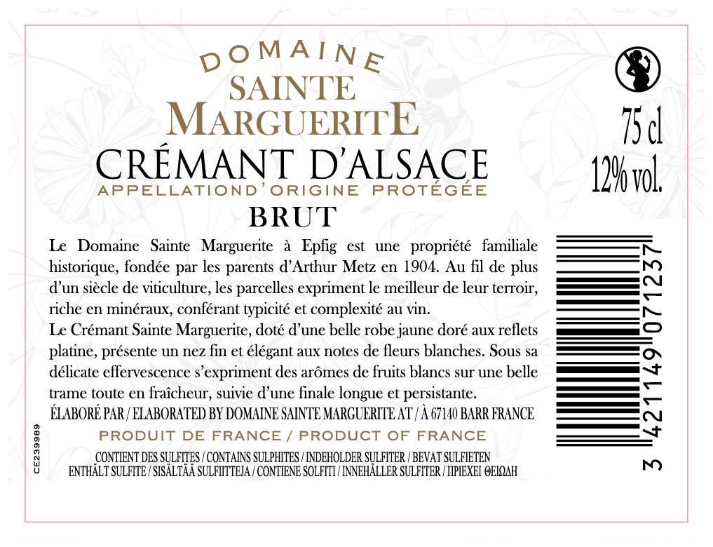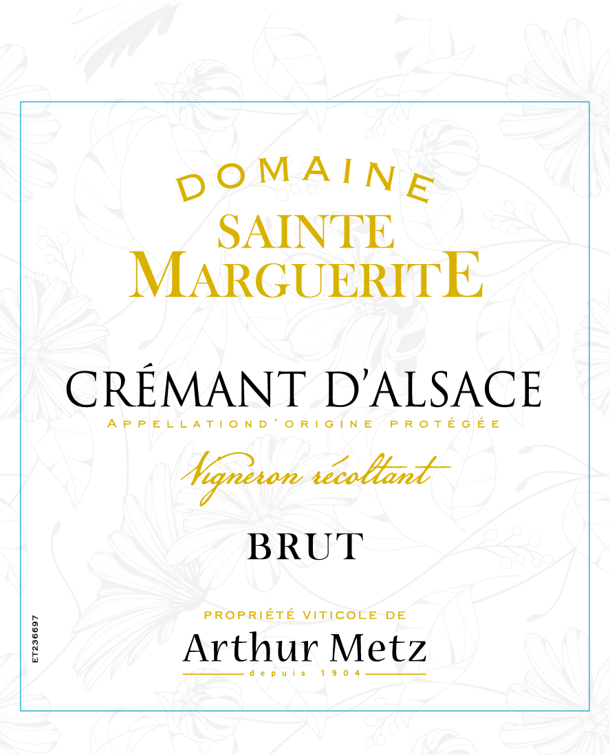 | Libellé | Alsace AOP Arthur Metz Domaine sainte marguerite brut aop cremant d'alsace blanc 0.75l - Brut - 75 cl |