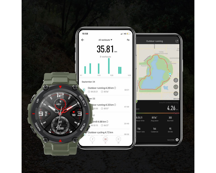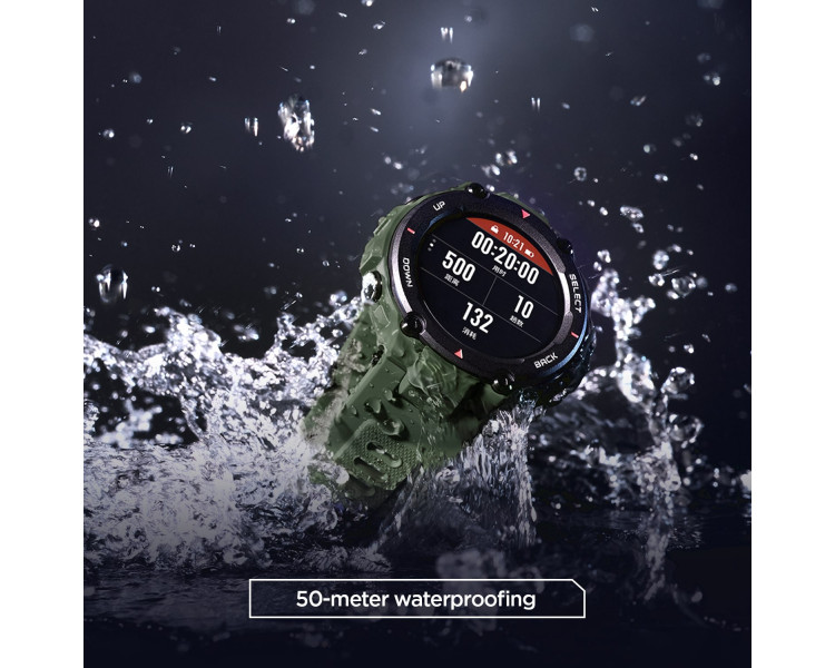 Amazfit T-Rex. Taille de l'écran: 3,3 cm (1.3"), Technologie d'affichage: AMOLED, Résolution de l'écran: 360 x 360 pixels, Écran tactile. GPS (satellite). Capacité de la batterie: 390 mAh. Poids: 58 g. Humidité : étanche jusqu'à: 50 m, Couleur du bracelet: Vert. Système d'exploitation installé: RTOS