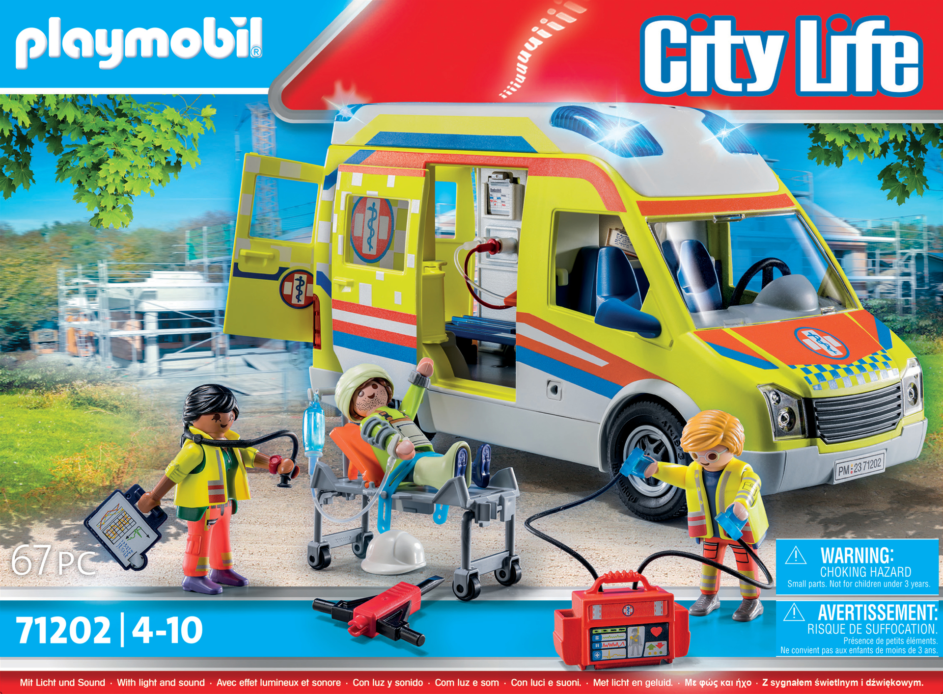 Ne bougez pas madame, les secours arrivent ! A toutes les unités, une dame nous signale un accident sur l'axe principal de la ville, nous demandons une équipe sur place de toute urgence. L'ambulance Playmobil active ses gyrophares pour filer à toute allure sur l'autoroute. Elle se faufile entre tous les véhicules pour arriver le plus vite possible au chevet des blessés. A l'intérieur de cette dernière, tout le nécessaire de premier secours est disponible. Bien évidemment, l'incontournable brancard à roulette peut se ranger facilement à l'intérieur. Ce set permet aux enfants de découvrir l'univers des secouristes et l'organisation d'un service d'urgence. Avec effets lumineux et sonores (Nécessite 3 piles 1,5 V type AAA non fournies)