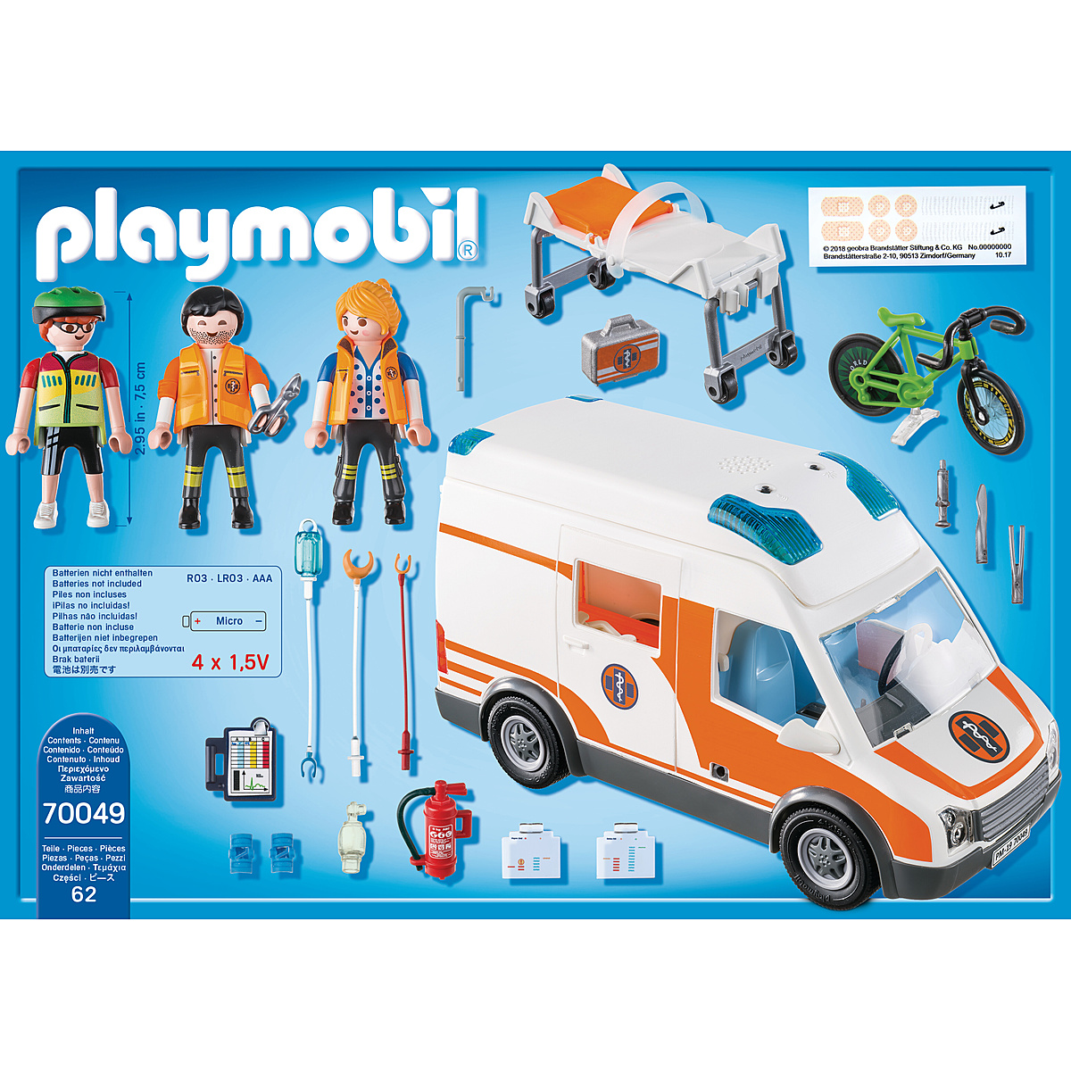 Contient 3 personnages, 1 civière, un vélo et des accessoires (trousses de secours, seringue, ciseaux)