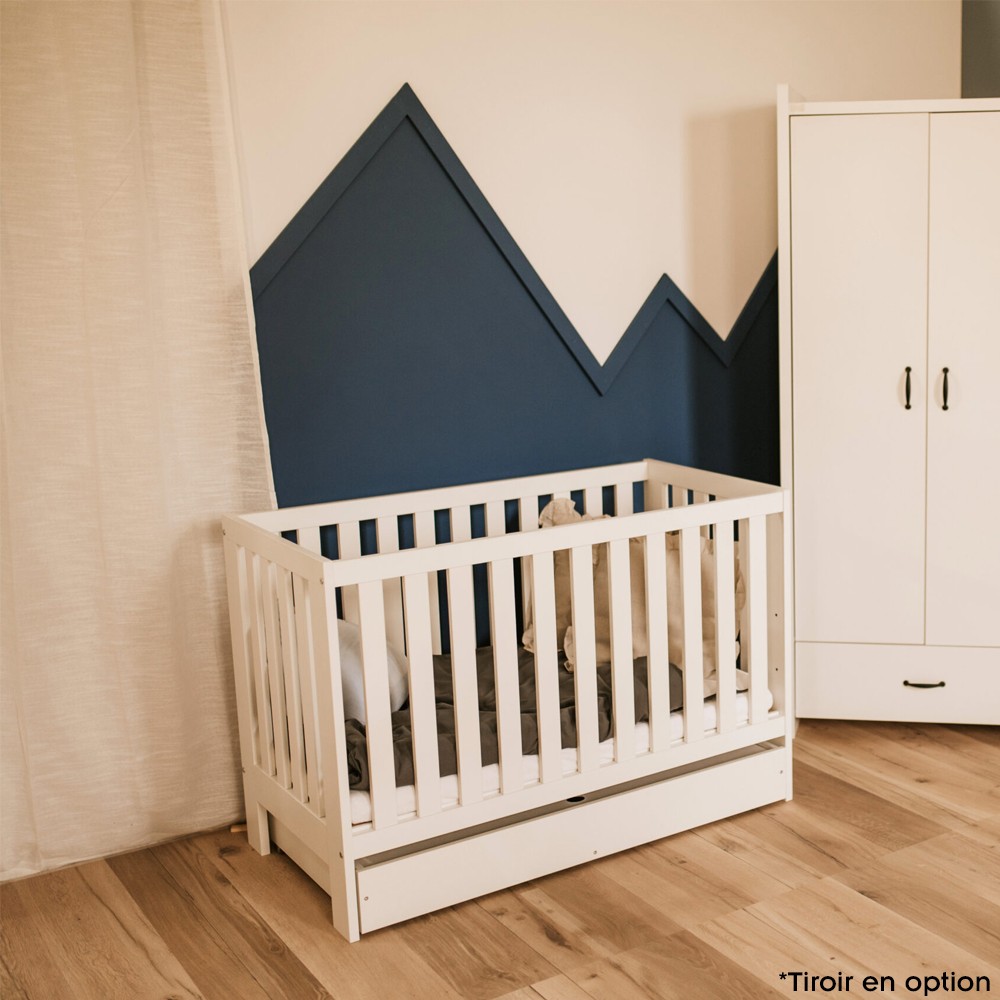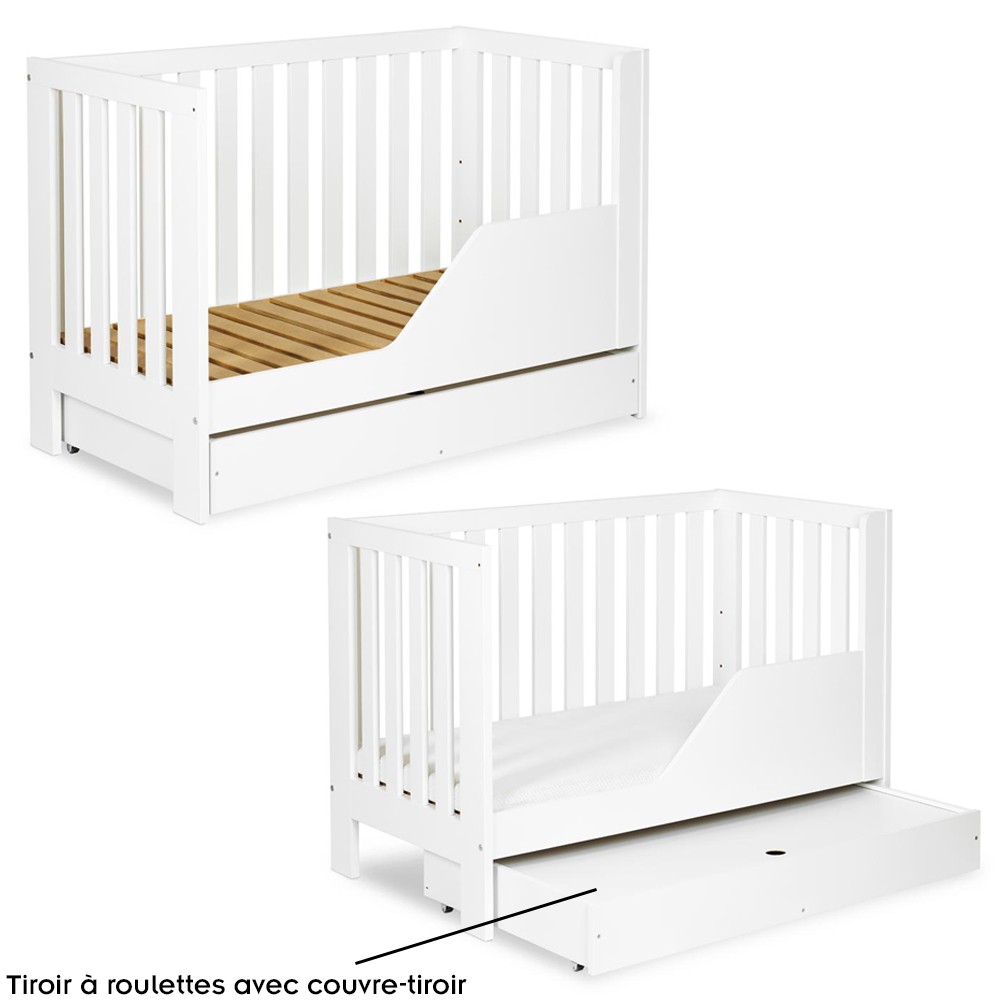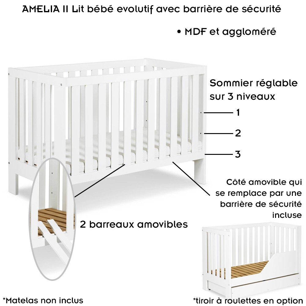 | Libellé | AMELIA II Lit bébé évolutif avec barrière de sécurité Blanc Avec tiroir |