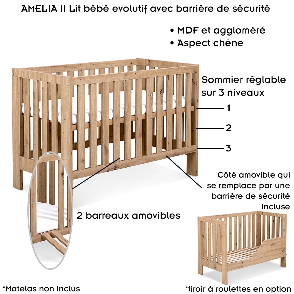 | Libellé | AMELIA II Lit bébé évolutif avec barrière de sécurité Chêne Avec tiroir |