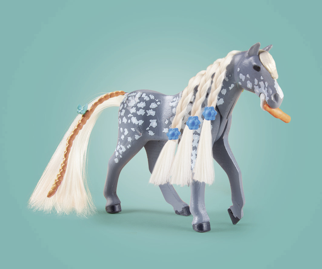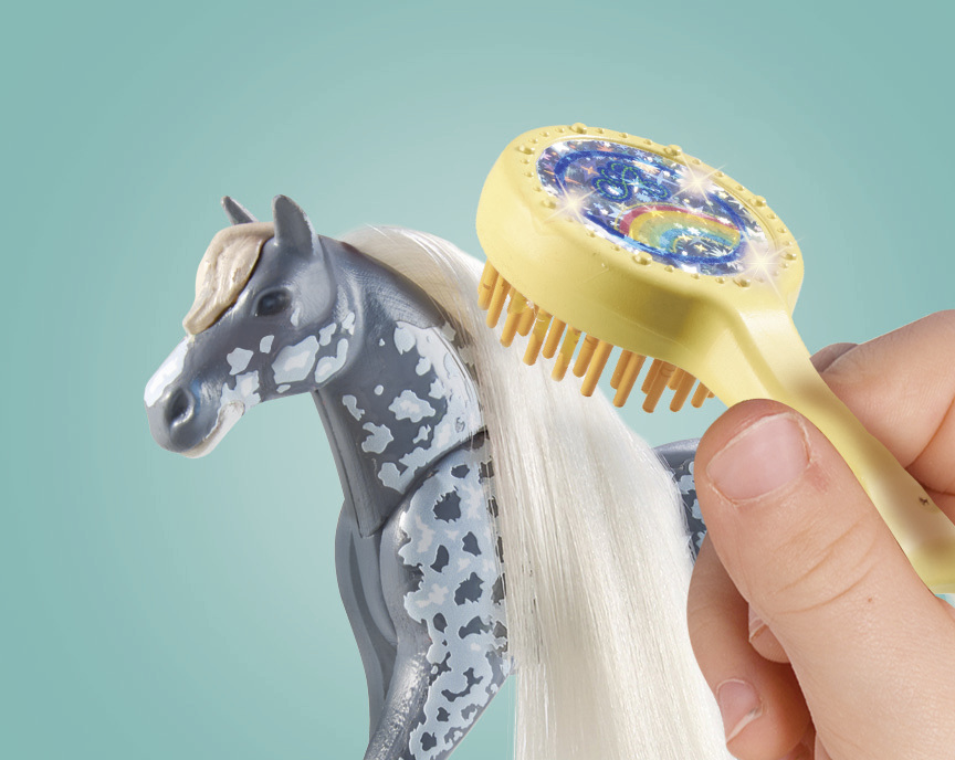 Il y a des alpagas dans l’enclos d’un cheval ? Amelia est une jeune fille connue pour être très appréciée par les animaux. Elle les aime et ils le savent ! C’est pourquoi il y a souvent des animaux qui viennent la voir quand elle s’occupe de son étalon Paso Fino, Whisper. Elle aime brosser la crinière et la queue de son cheval et les styliser en lui faisant des nattes tout en étant entourée de tous ces animaux. Le coffret comprend Amelia, son cheval Whisper dont la crinière et la queue peuvent être peignées, un box et un enclos, un alpaga et son petit, un poulain, un chien et de nombreux autres accessoires.