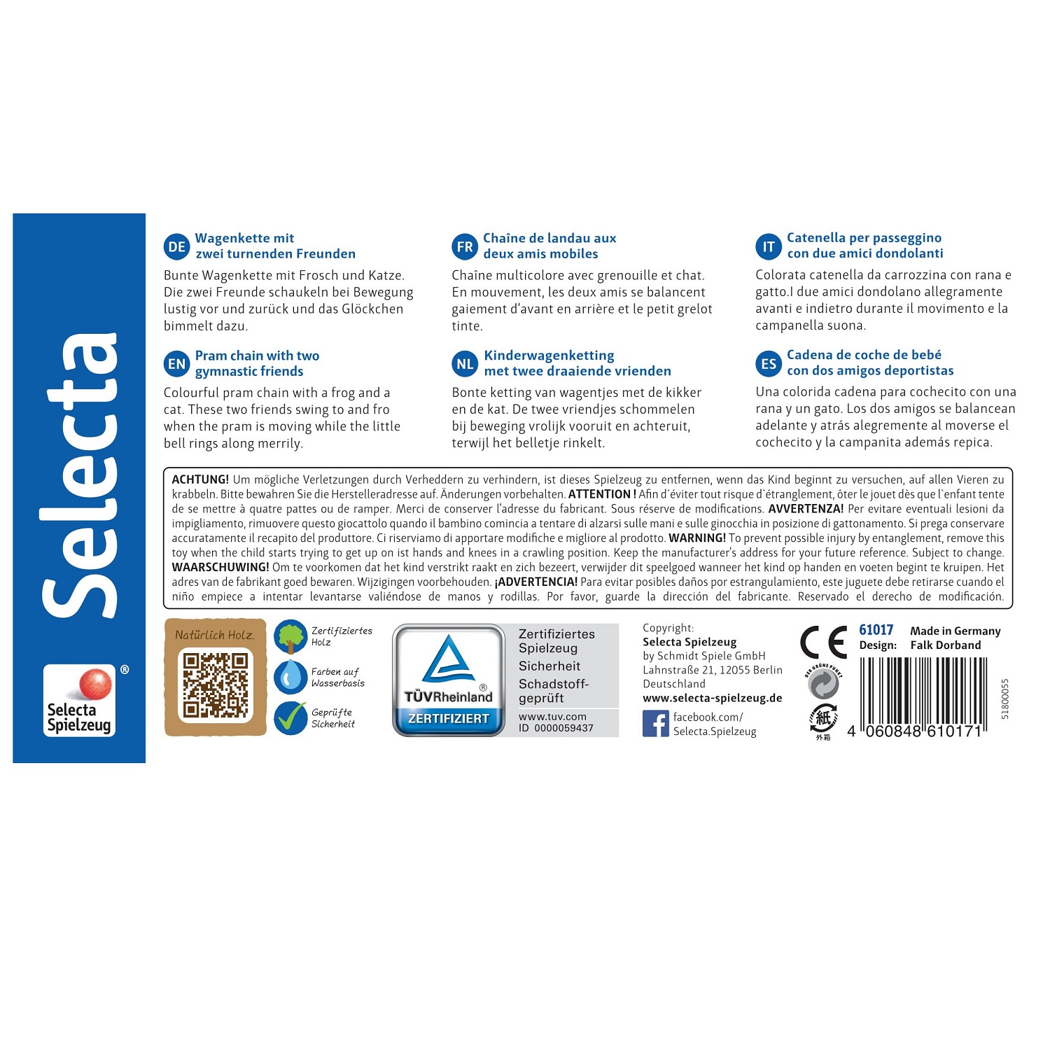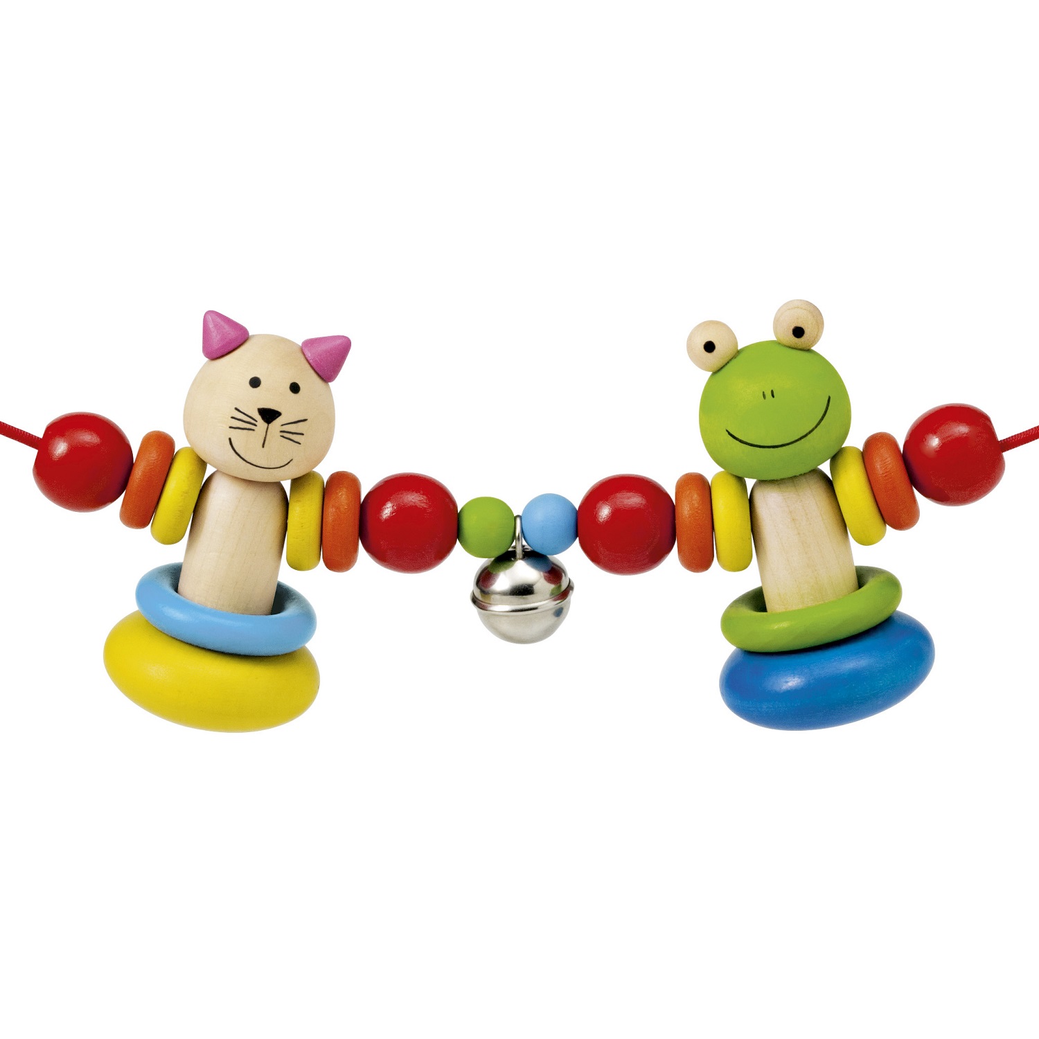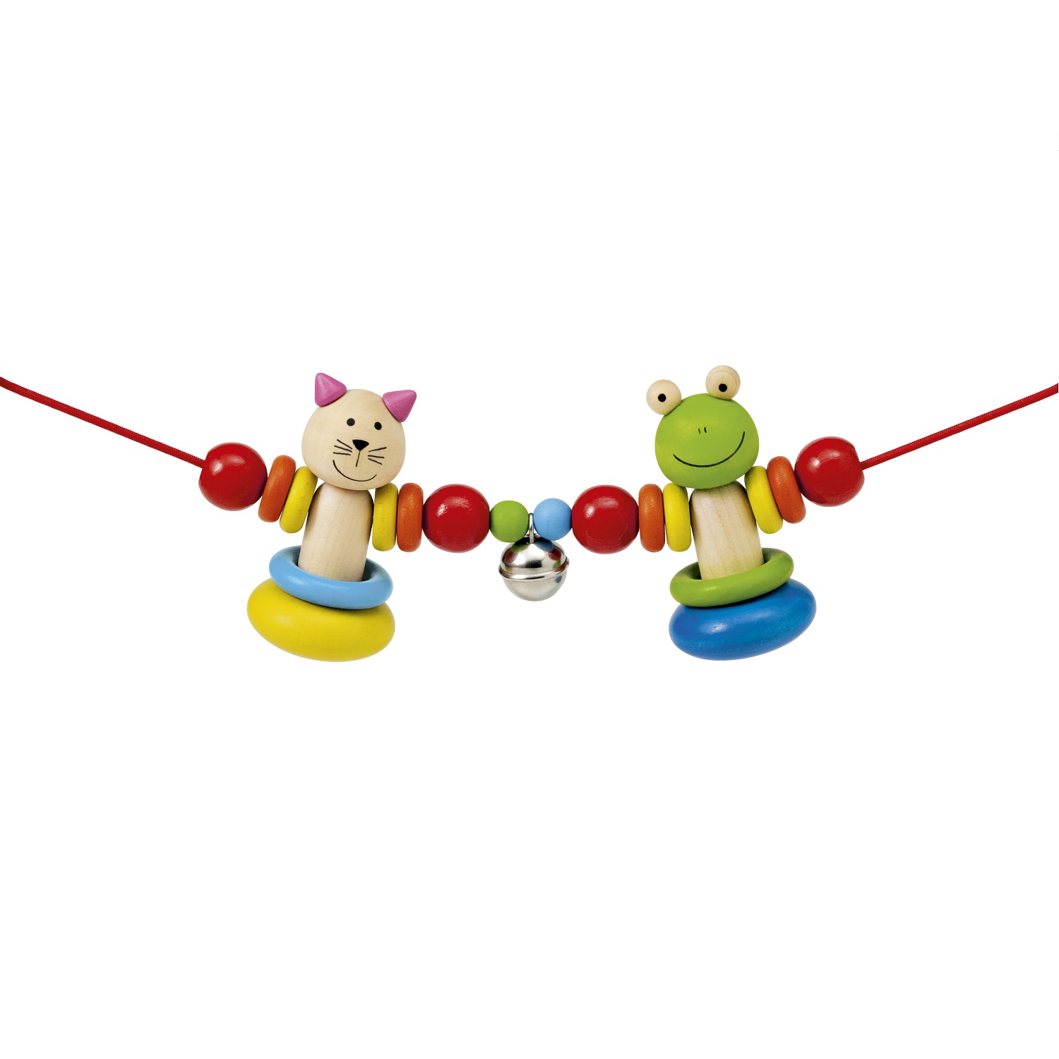 Chaîne multicolore avec grenouille et chat. En mouvement les deux amis se balancent gaiement d'avant en arrière et le petit grelot tinte.