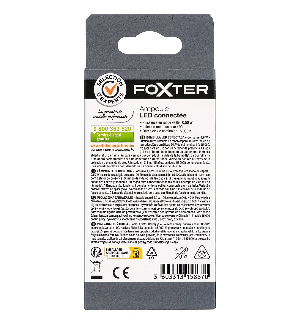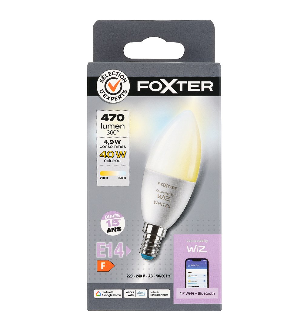 | Libellé | Ampoule LED connectée flamme E14 40W lumière blanche - Sélection d'Experts - Foxter |