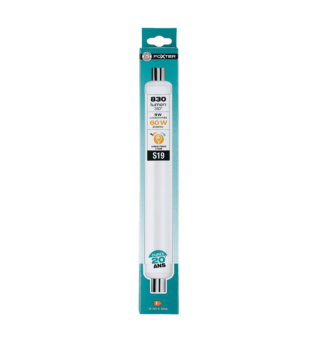 Ampoule LED tube S19 60W lumière chaude - Sélection d'Experts - Foxter - Ampoule LED énergie préservée - Forme : tube - Culot S19 - 830 lumens - Consomme 9W, éclaire 60W - Matière : verre - Finition du verre : dépoli - Température de couleur : 2700K - lumière chaude - Dimensions : 310 x 38 mm - Tension d'alimentation électrique : 220 - 240 V - Index de rendu couleur : 80 - Durée de vie nominale : 20 000h, environ 20 ans* *20 ans soit 20 000h de fonctionnement. Cette durée de vie est calculée sur la base de 2h à 3h de fonctionnement par jour.