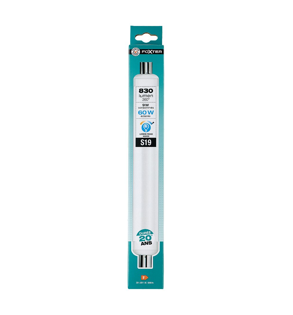 Ampoule LED tube S19 60W lumière froide - Sélection d'Experts - Foxter - Ampoule LED énergie préservée - Forme : tube - Culot S19 - Matière : verre - Finition du verre : dépoli - 830 lumens - Consomme 9W, éclaire 60W - Température de couleur : 4000K - lumière froide - Dimensions : 310 x 38 mm - Tension d'alimentation électrique : 220 - 240 V - Index de rendu couleur : 80 - Durée de vie nominale : 20 000h, environ 20 ans* *20 ans soit 20 000h de fonctionnement. Cette durée de vie est calculée sur la base de 2h à 3h de fonctionnement par jour.
