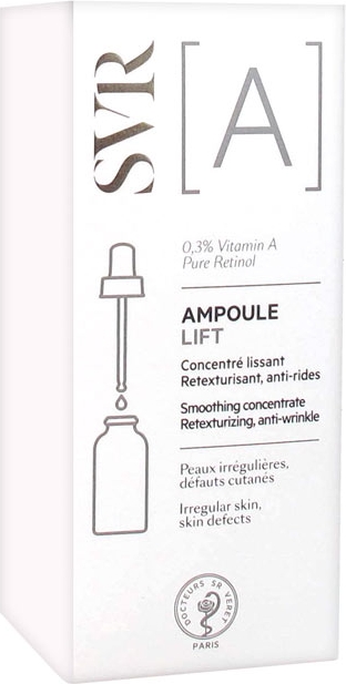 SVR [A] Ampoule Lift Concentré Lissant 30 ml est un sérum ultra-concentré en vitamine A - Rétinol et chrono-libéré (0,3%). Il retexturise le tissu cutané pour lisser les peaux irrégulières, les défauts cutanés, les pores dilatés et les rides. Jour après jour, le grain de peau s'affine, la qualité de peau s'améliore, les signes de l'âge sont estompés. Son efficacité est visible dès 7 jours d'application.