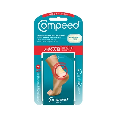 Le pansement Compeed Ampoules Extrêmes est à utiliser dès les premiers signes de frottements, pour prévenir l'apparition d'une ampoule. Vous pouvez également l'utiliser sur une ampoule déjà formée, pour soulager la douleur et aider à accélérer la cicatrisation. Appliquez le pansement sur une peau propre et sèche. Ne l'appliquez pas sur une plaie infectée. Pour une adhérence optimale, assurez-vous que la peau soit exempte de crème ou d'huile. Appliquez le pansement directement sur l'ampoule, ou sur le talon ou côté du pied ou orteil en prévention, en évitant le contact avec la partie adhésive et aplatissez-en les bords. Laissez le pansement COMPEED® en place jusqu'à ce qu'il se décolle de lui-même. Pour enlever le pansement, tirez-le doucement le long de la peau. Pour de meilleurs résultats, utilisez COMPEED® jusqu'à ce que la peau soit totalement cicatrisée. En cas de diabète, consultez un médecin avant l'utilisation. Ne coupez jamais un pansement COMPEED® En cas de résidus d'adhésif sur les bas, chaussettes ou chaussures, nettoyez-le à l'aide d'essence de térébenthine (White Spirit).