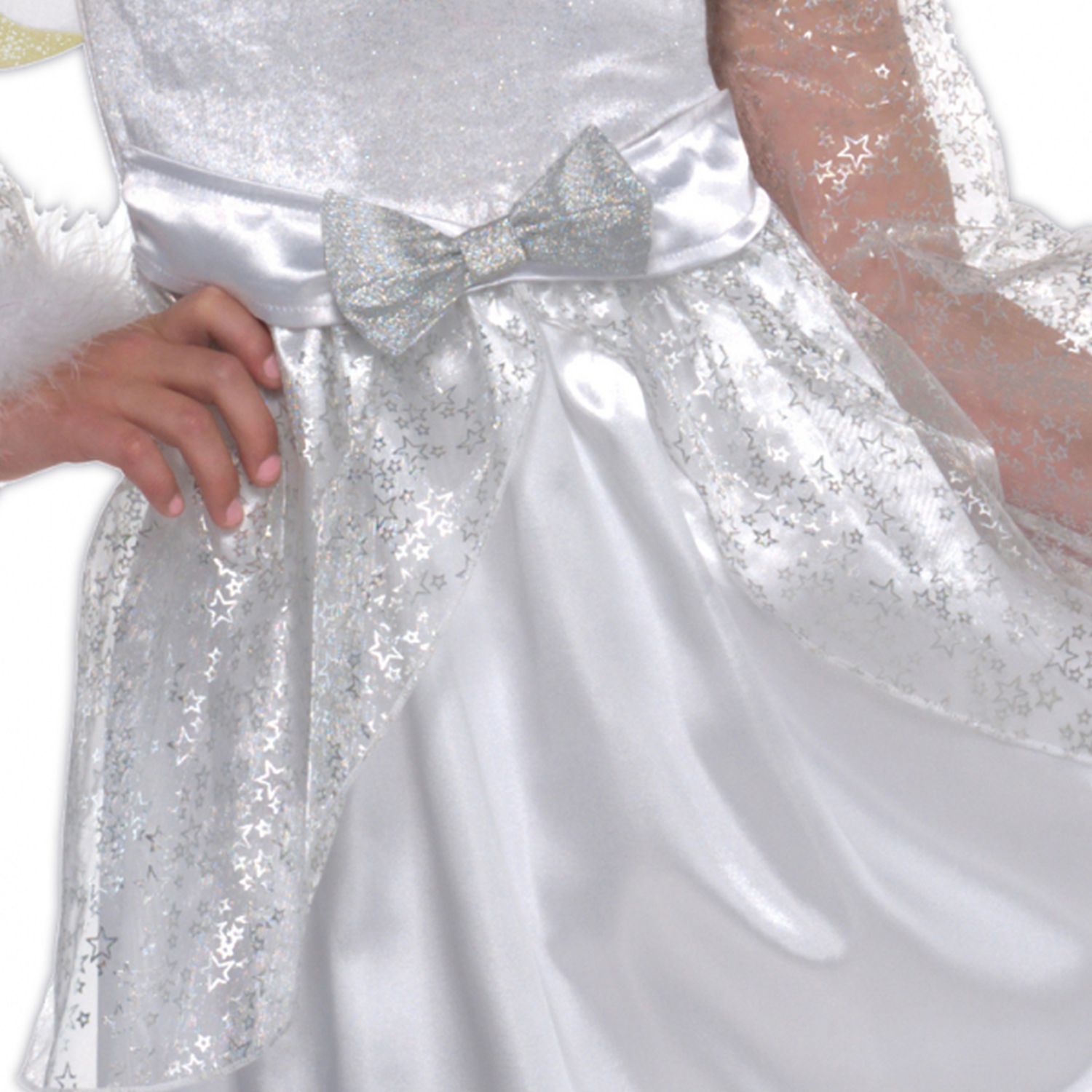 Cette robe comprend un corsage de velours blanc, avec une partie froncée étincelante au niveau du cou, des manches drapées en tissu transparent irisé, ainsi qu’une jupe satinée blanche qui comporte un panier brillant de chaque côté. Un nœud argenté vient orner la jupe. Une paire d’ailes semi-transparentes à décorations dorées et à monture en fil de fer est également comprise. Elle s’attache grâce à du velcro. Et pour couronner ce bel ange, trouvez également un serre-tête satiné orné d’une auréole.