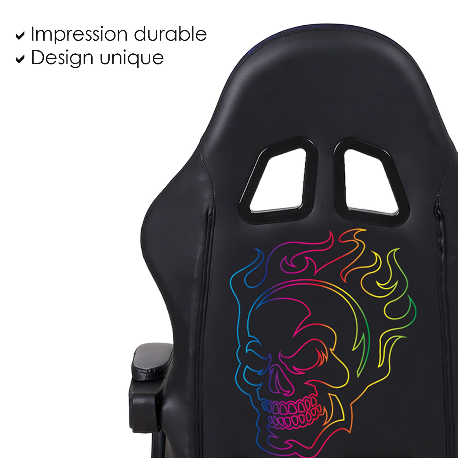 Amstrad vous propose sa chaise gamer à LED AMS-900-LED-SKULL. Donnez du style à votre setup avec ce design original de "tête de mort" au couleur arc-en-ciel au dos du fauteuil !