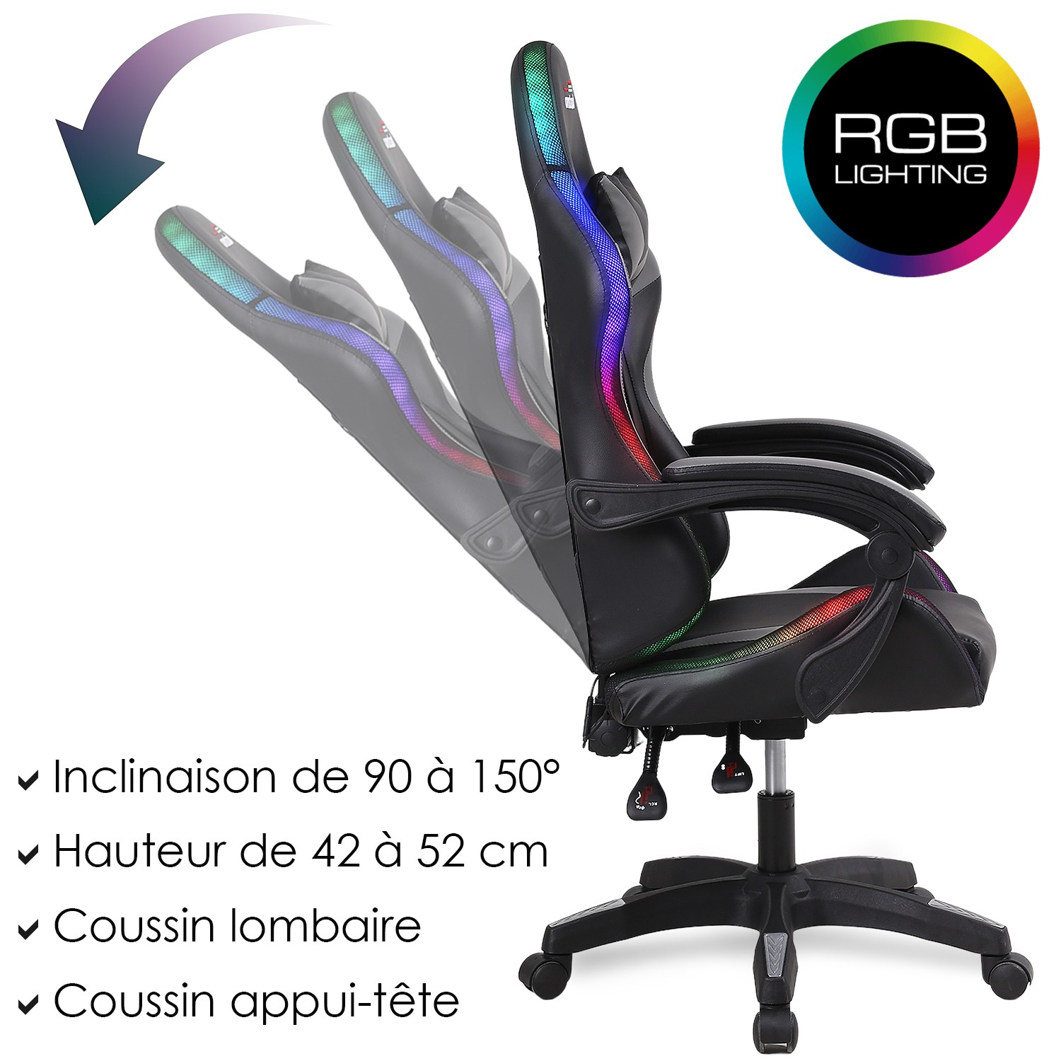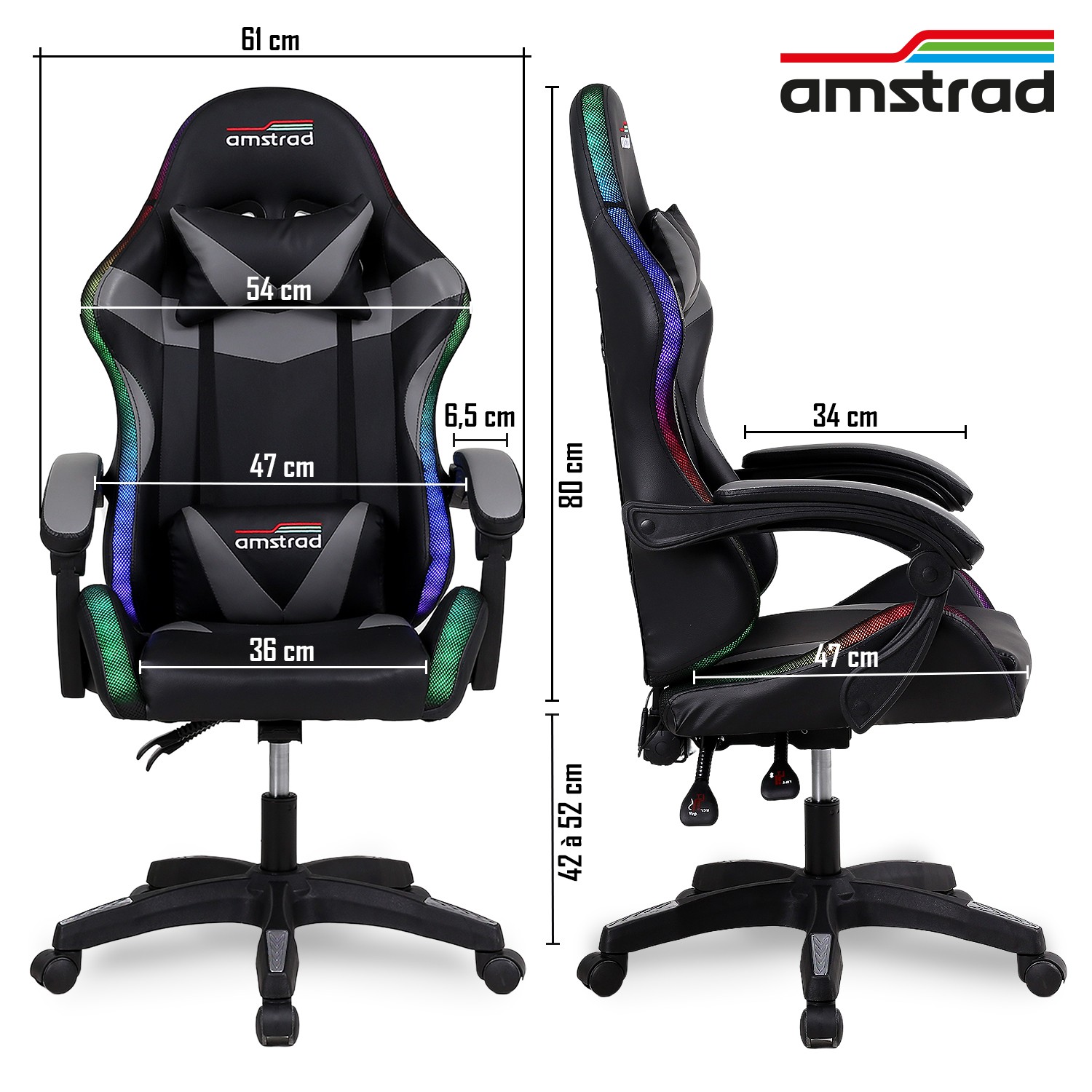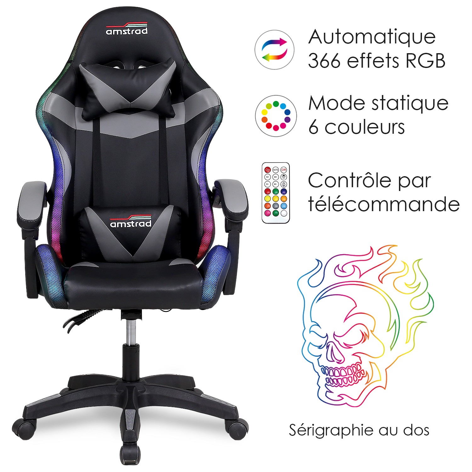 | Libellé | Amstrad AMS-900-LED-SKULL - Fauteuil gaming noir et gris - Serigraphie "Tête de mort" - Eclairage LED 366 effets - Télécommande |