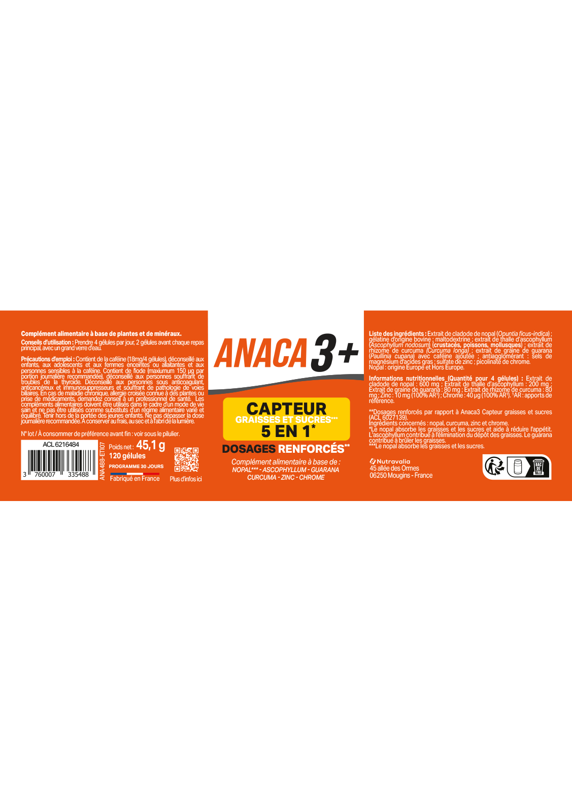 Ingrédients : Extrait de cladode de nopal (opuntia ficus indica) ; gélatine ; maltodextrine ; extrait de thalle d’ascophyllum (ascophyllum nodosum)(crustacés, poissons, mollusques) ; curcumine ; extrait de graine de guarana (paullinia cupana) ; antiagglomérant : sels de magnésium d'acides gras ; sulfate de zinc ; antiagglomérant : dioxyde de silicium [nano] ; picolinate de chrome.