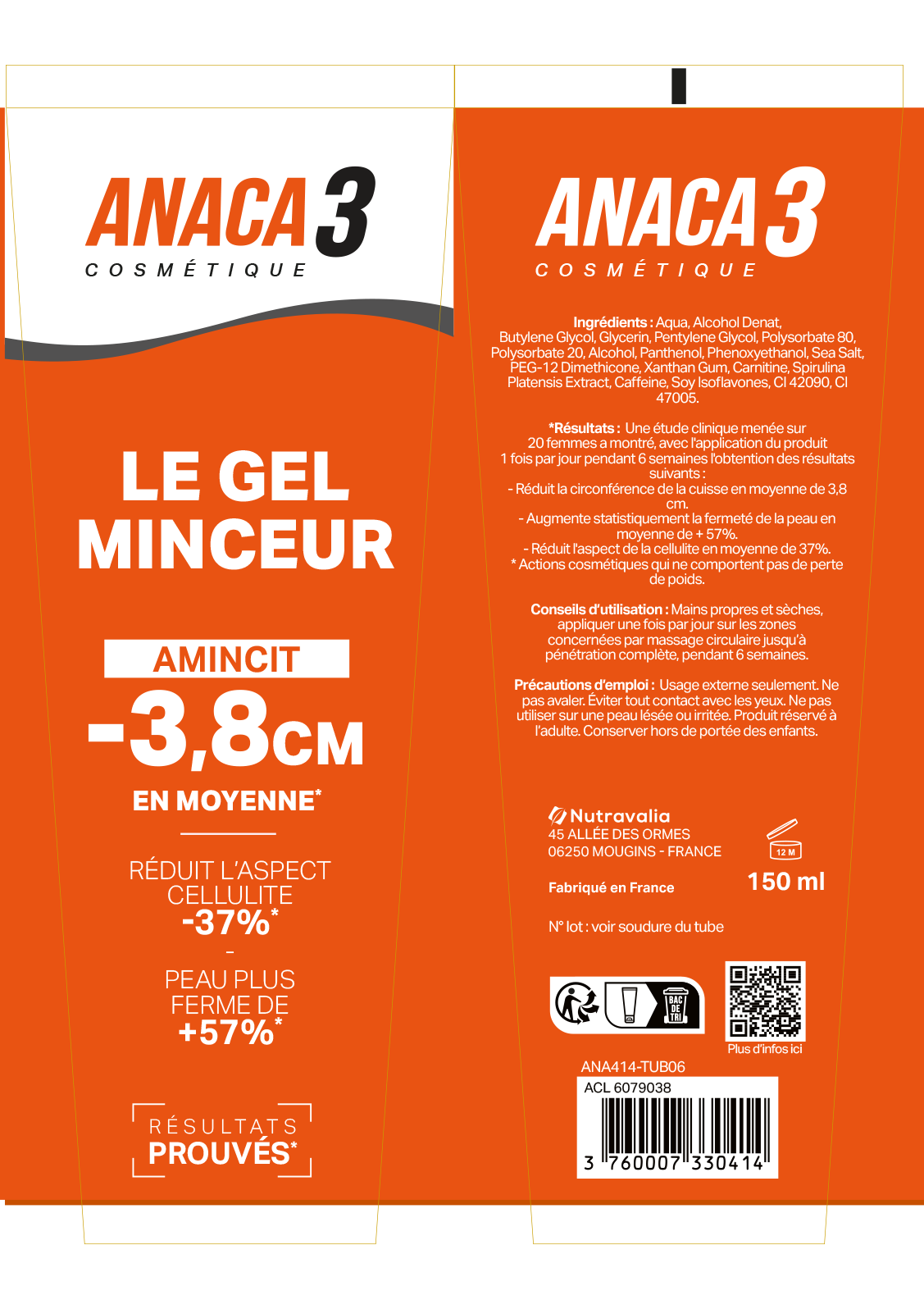 Anaca3 Le Gel Minceur 150 ml est un gel qui : réduit la circonférence de la cuisse en moyenne de 3,8 cm, augmente statistiquement la fermeté de la peau en moyenne de +57%, réduit l'aspect de la cellulit en moyenne de 37%. Résultats sur une étude clinique menée sur 20 femmes avec application du produit 1 fois par jour pendant 6 semaines. Fabriqué en France.