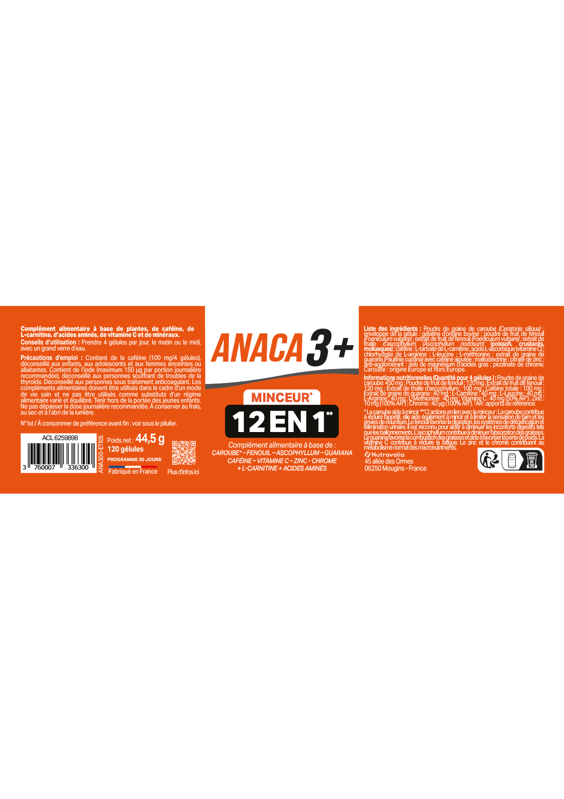 Anaca3 + Minceur 12 en1 120 Gélules est un complément alimentaire à base de plantes, de caféine, de L-carnitine, d'acides aminés, de vitamine C et de minéraux. Sa formule développe 12 actions en lien avec la minceur : La caroube contribue à réduire l'appétit, elle aide également à mincir et à limiter la sensation de faim et les envies de nourriture. Le fenouil favorise la digestion, les systèmes de détoxification et l'élimination urinaire. Il est reconnu pour aider à diminuer les inconforts digestifs tels que les ballonnements. L'ascophyllum contribue à diminuer l'absorption des graisses. Le guarana favorise la combustion des graisses et aide à favoriser la perte de poids. La vitamine C contribue à réduire la fatigue. Le zinc et le chrome contribuent au métabolisme normal des macronutriments. Fabriqué en France.