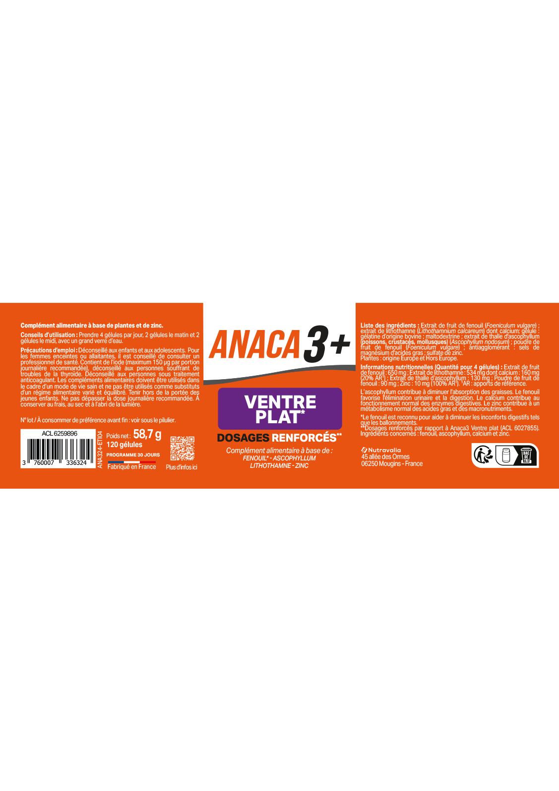 | Libellé | Anaca3+ Ventre Plat 120 Gélules |
