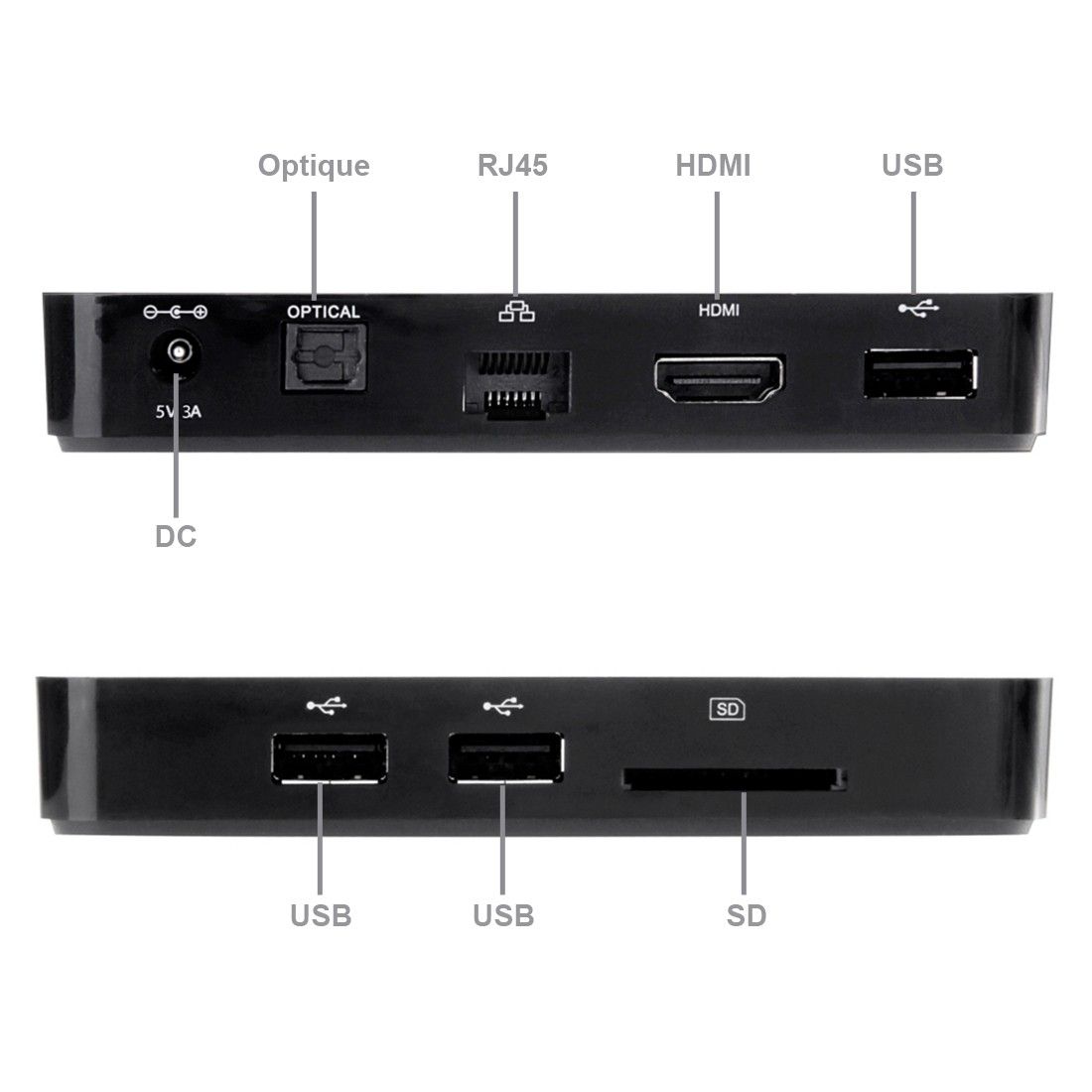 Ports : 1x Ethernet/1x HDMI/3x USB/1x Micro SD/1x SATA/1x SPDIF (optique)
