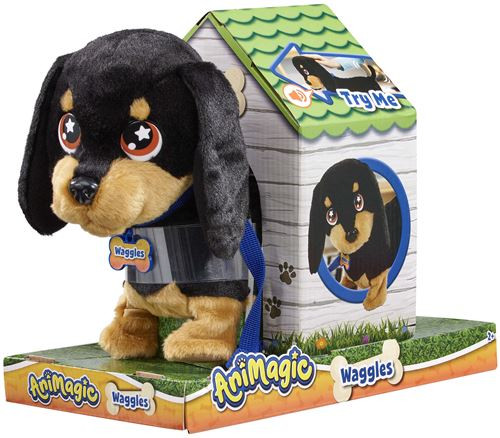 Waggles est un adorable Teckel qui adore les longues balades. Comme un vrai Teckel, il marche et remue la queue de facon rigolote. Il adore les câlins et aboie quand il est content ! Fourni avec une laisse pour que lenfant puisse s'amuser à sa compagnie et le promener. Waggles est le compagnon idéal pour les petits enfants dès 3 ans.