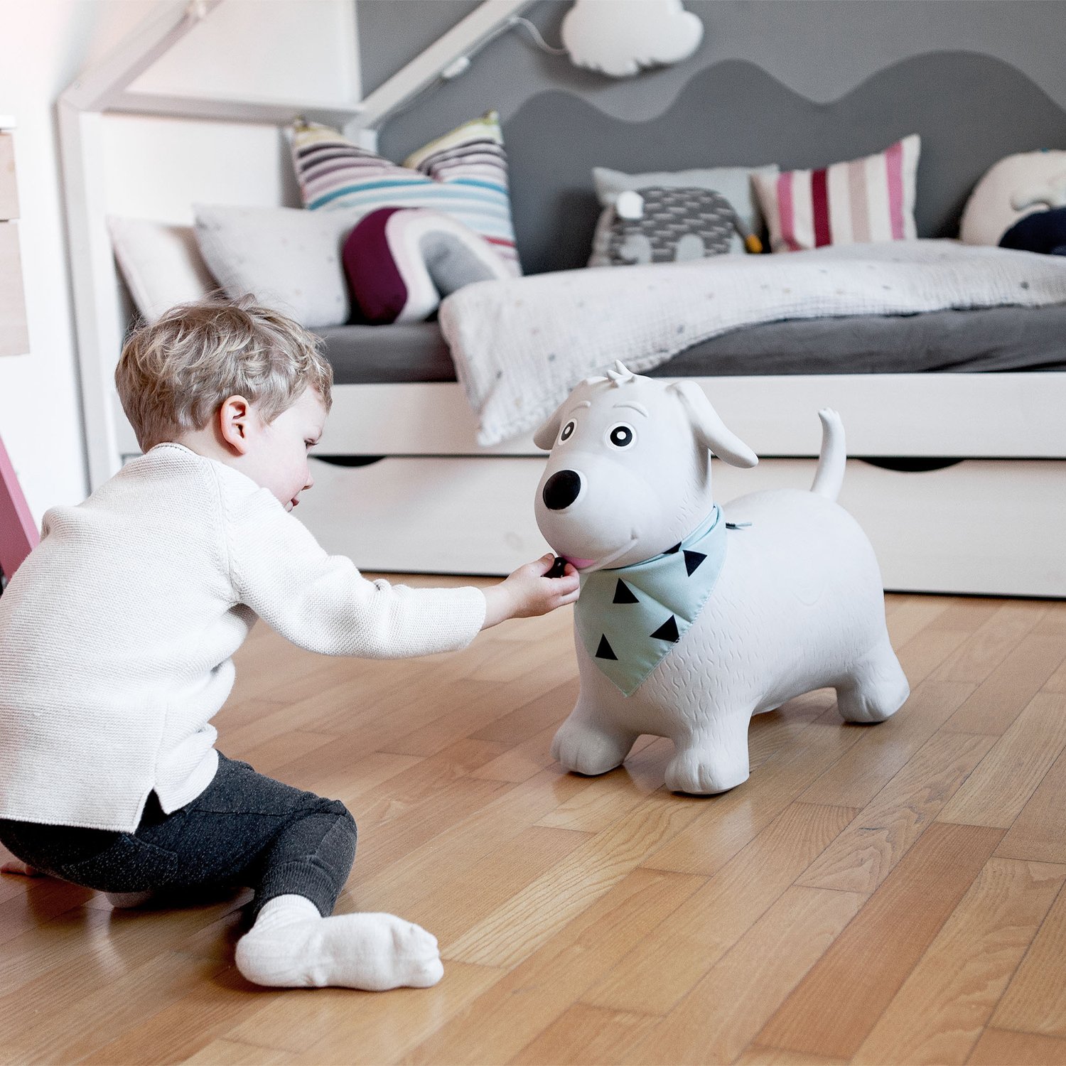 L'animal sauteur de Kindsgut fait briller les yeux des enfants et garantit un plaisir de jeu durable. Cet adorable animal sauteur peut être utilisé aussi bien à l'intérieur qu'à l'extérieur. Mais l'animal sauteur invite également à jouer librement et avec imagination et peut être caressé, nourri ou promené. Un must pour tous les petits fans d'animaux ! L'animal gonflable aux différents designs se gonfle rapidement grâce à la pompe à air fournie et peut être regonflé à volonté si nécessaire. L'animal sauteur est disponible en différents designs discrets et chaque animal mignon convient aussi bien aux filles qu'aux garçons. Chaque animal sauteur aide ton enfant à améliorer ses capacités motrices. Qualité supérieure : l'animal sauteur de qualité supérieure garantit un plaisir de jeu durable - même pour les frères et sœurs. Respectueux de l'environnement : l'animal sauteur est fabriqué à partir de matériaux respectueux de l'environnement, il ne contient pas de substances nocives et sa finition est adaptée aux enfants. Jouet éducatif : avec le jouet sauteur, ton enfant peut améliorer ses capacités motrices, par exemple l'équilibre et la coordination des yeux, des mains et des pieds. Pour un maintien sûr, l'animal sauteur offre une assise agréable et la possibilité de bien s'accrocher avec les mains. Facile à nettoyer : Le matériau robuste est facile à essuyer avec un chiffon humide ou à nettoyer sous l'eau courante. Polyvalent : il peut être utilisé aussi bien à l'intérieur qu'au jardin et peut supporter jusqu'à 50 kg. Pour tous les goûts : les animaux gonflables Kindsgut existent en cinq variantes au total (chien, cheval, dino, élan et licorne). Le cadeau parfait : un animal sauteur est le cadeau idéal pour le deuxième ou le troisième anniversaire, pour Noël (surtout l'élan) ou pour Pâques. Avec l'amour du détail : l'animal sauteur est joliment emballé et livré dans un carton Kindsgut de haute qualité. Poids de l'article : 1,35 kg Dimensions de l'article : 50 x 26 x 60 cm Capacité de charge jusqu'à 50 kg max. Recommandé à partir de l'âge de 24 mois