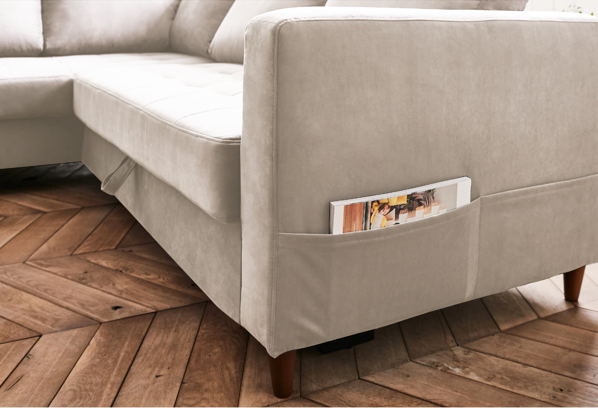 Fabriqué en Europe à la main, le canapé d’angle convertible Anna a été travaillé afin d’avoir un confort maximal. La profondeur d’assise de 56 cm et les coussins de dossiers vous permettront d’être bien installé et soutenu comme il le faut. Le coussin posé sur l'accoudoir apporte une sensation enveloppante. La fonction convertible sous l’assise vous facilitera l’accueil de votre entourage pour un couchage occasionnel. Une poche se trouve sur l'extérieur de l'accoudoir afin d'y placer des magazines ou une télécommande.