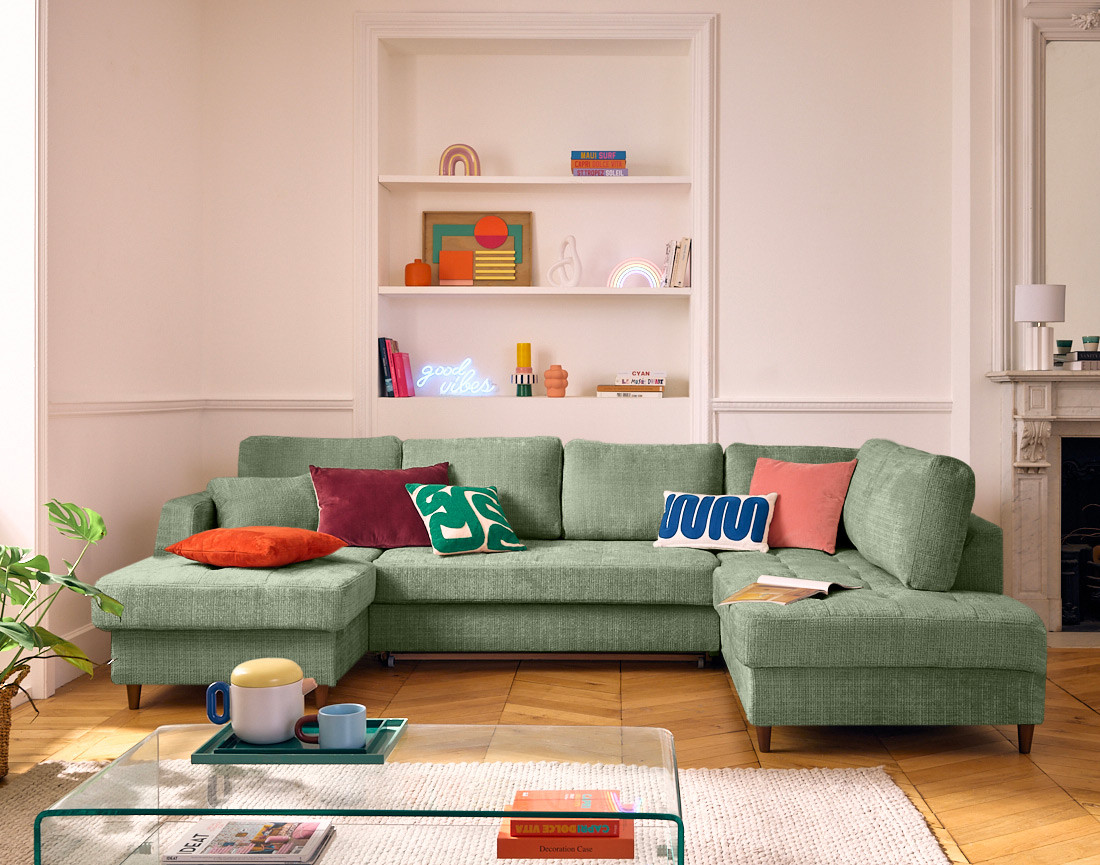 | Libellé | Anna - canapé panoramique d'angle droit 7 places convertible avec coffre en velours texturé |
