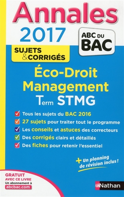Annales 2017 ABC du Bac Économie-Droit Management des Organisations Term STMG ¤ Des sujets sur tout le programme . Les sujets complets du Bac 2016. . Des sujets des sessions antérieures pour traiter tout le programme. . Un minutage pour se mettre dans les conditions de l'épreuve. . Tous les corrigés détaillés avec des rubriques d'aide. ¤ La méthode pour le Bac . L'épreuve expliquée et les critères d'évaluation de votre copie. . Les conseils pratiques des correcteurs. . Les stratégies à adopter pour bien traiter les sujets. ¤ La synthèse des cours . Des fiches de révision pour retenir les points-clés. . Un lexique et un index thématiques. . Les principaux chiffres de l'économie et les textes juridiques à connaître.