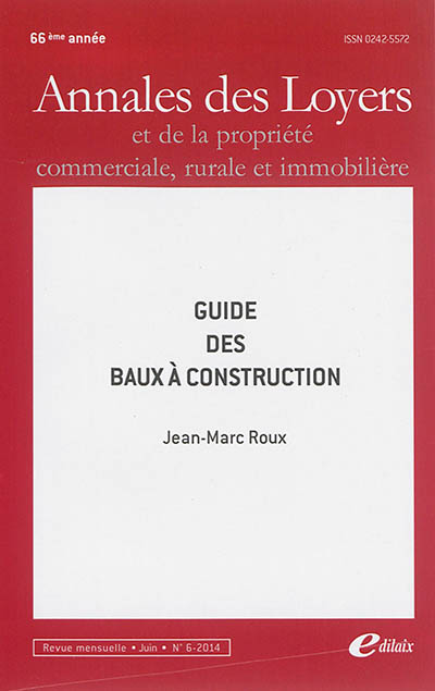 | Libellé | Annales des loyers et de la propriété commerciale, rurale et immobilière - Numéro 6 (2014) : Guide des baux à construction (Revue) |