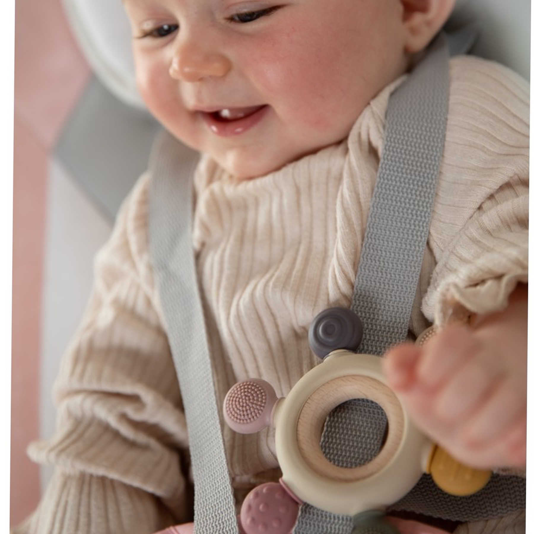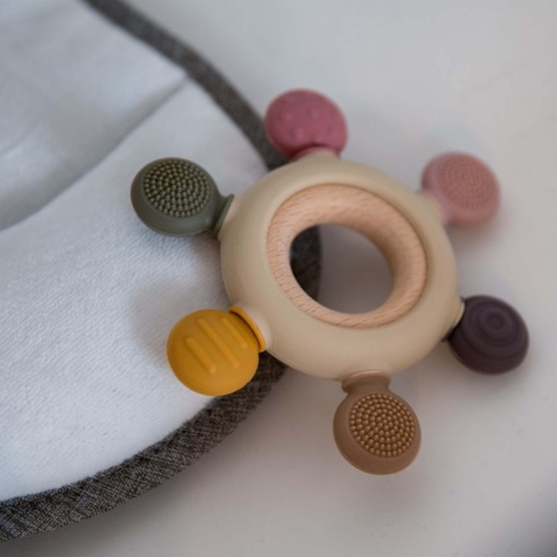 Ajoutez cet anneau de dentition multi-sensoriel à votre panier et offrez à votre bébé un jouet apaisant et stimulant !