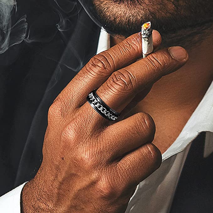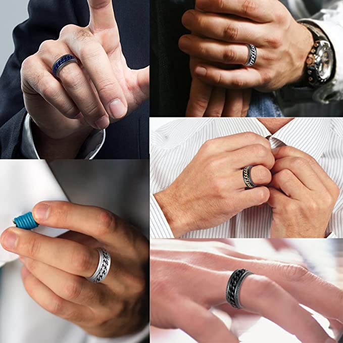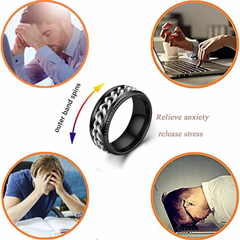 Les anneaux ont un design incrusté de chaîne de bord, vous pouvez faire tourner la chaîne pour soulager l'anxiété et l'ennui. Ils sont fabriqués en acier inoxydable, solides et durables, ne se décolorent jamais, ne rouillent jamais, imperméables, confortables à porter.