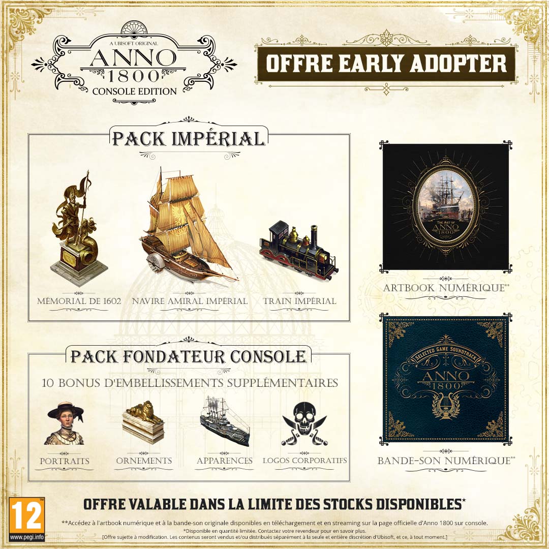 Contenu bonus : Aaccès au pack impérial et au pack Pionnier sur console ! (Offre valable dans la limite des stocks disponibles. Disponible en quantité limitée.) Plus-Produit : UNE OFFRE EARLY ADOPTER À NE PAS RATER : contient un artbook digital, la bande-son du jeu au format numérique (Offre valable dans la limite des stocks disponibles. Disponible en quantité limitée.) Bienvenue à l'aube de l'Ère industrielle dans ce jeu de gestion-construction en temps réel. Soyez au coeur d'une des époques les plus riches en mutations de toute l'histoire. Découvrez de nouvelles technologies, de nouveaux continents et de nouvelles sociétés. Bâtissez un nouveau monde à votre image ! L'AUBE D'UNE NOUVELLE ÈRE : à vous de bâtir de gigantesques métropoles, d'organiser des réseaux logistiques, de coloniser de luxuriants nouveaux continents et de dominer vos adversaires sur les plans diplomatique, commercial ou militaire. BÂTISSEZ VOTRE EMPIRE.