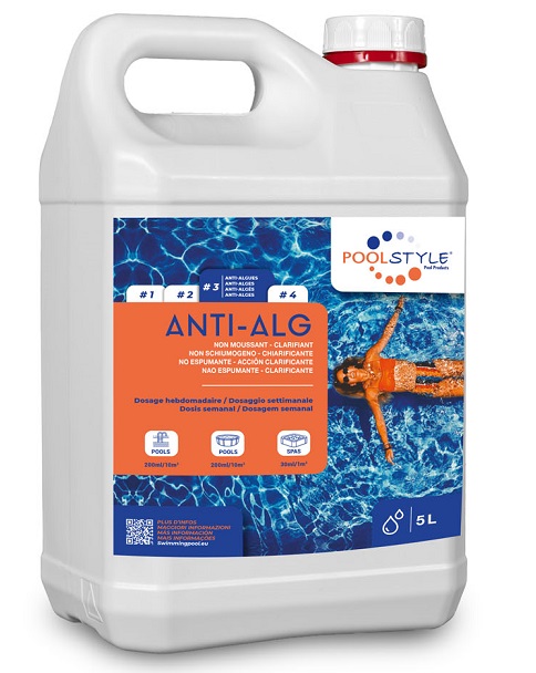 Ce liquide anti-algues de Poolstyle est un produit de nettoyage qui empêche la multiplication d'algues dans la piscine, idéal pour le traitement du bassin ou du spa grâce à sa triple action algicide, germicide et anticalcaire. C'est un excellent complément au traitement de fond, car il clarifie l'eau et réduit la consommation en chlore ou de brome. Il est recommandé d'exercer un traitement hebdomadaire de 1 l pour 100 m³, et/ou un traitement en complément à choc de 2 l pour 100 m³.