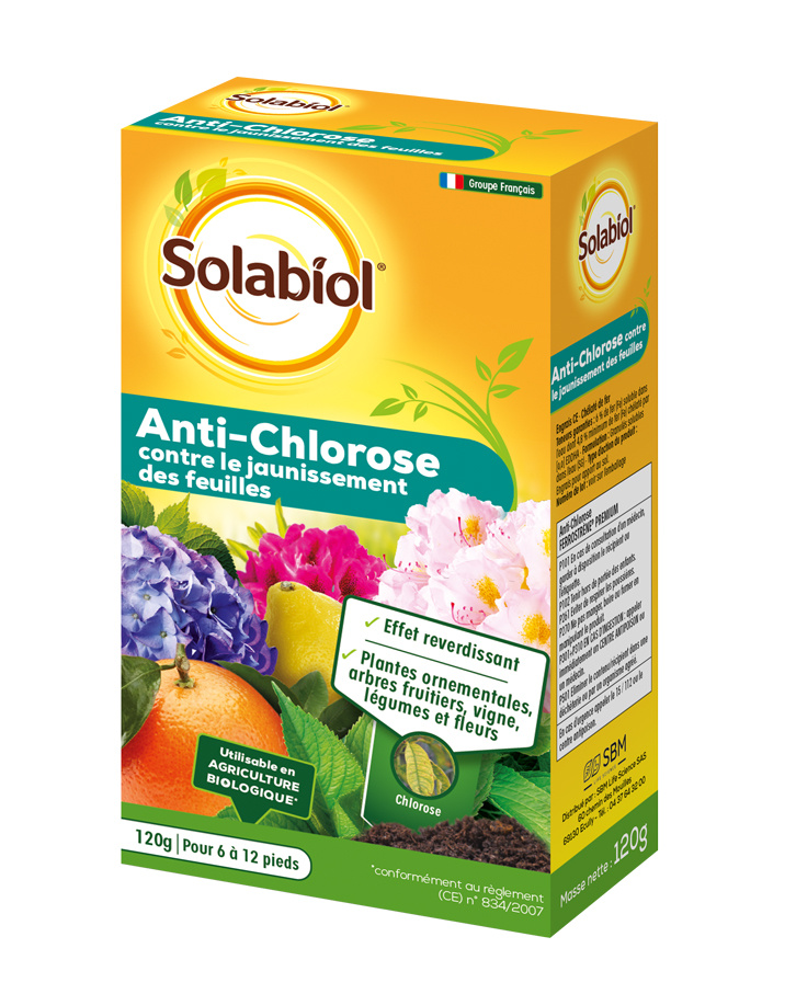 Contre le jaunissement des feuilles. Effet reverdissant. Contient du fer chélaté plus facilement assimilable par la plante.