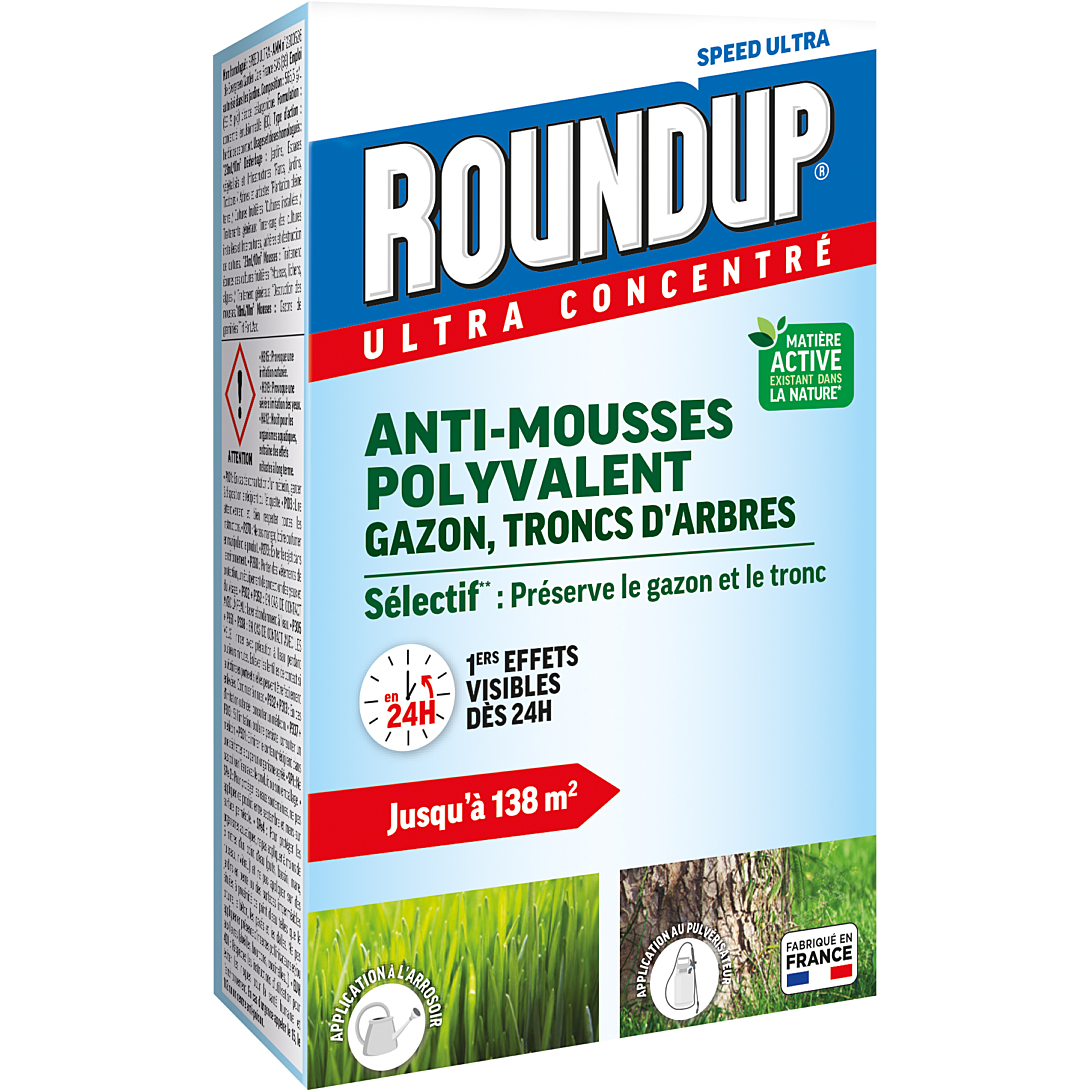 "Idéal pour détruire les mousses tout en préservant le gazon, l'anti-mousse Roundup 250mL à base d'acide pélargonique (565 g/l) élimine rapidement les mousses par simple contact. Il est polyvalent et s'utilise également pour éliminer les mousses des troncs d'arbres. Les résultats sont visibles dès le 1er jour. L'anti-mousse Roundup est sélectif et préserve intégralement votre gazon et vos troncs d'arbre (en respectant les doses indiquées)."