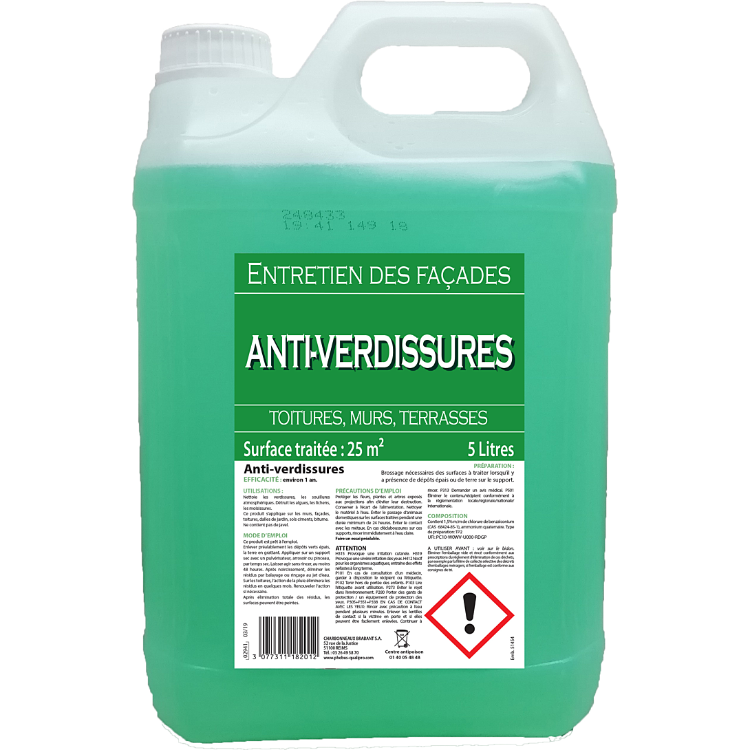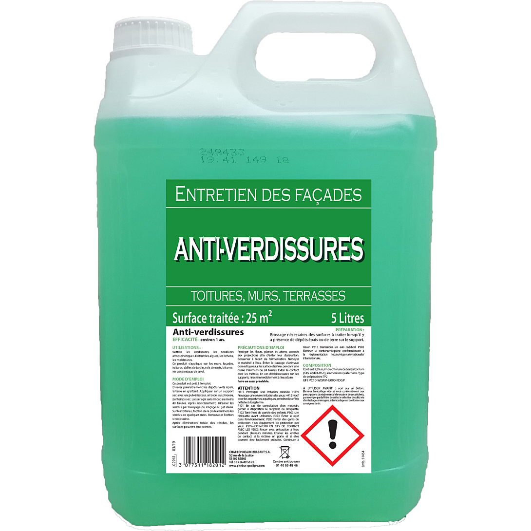 Détruit les algues et nettoie les souillures atmosphériques. Prêt à l'emploi. Efficace en 48h.