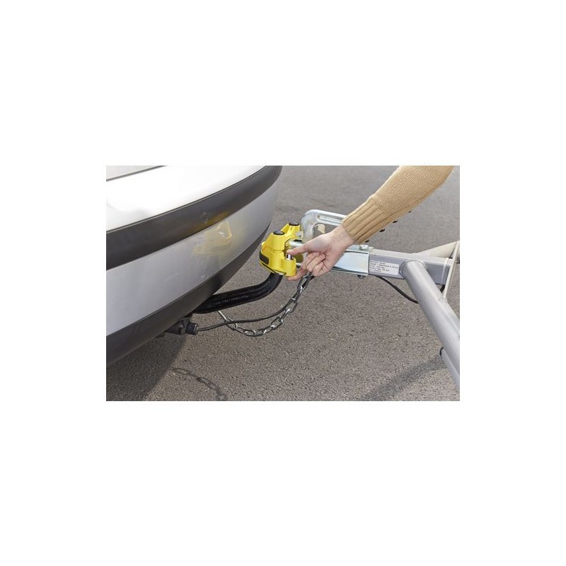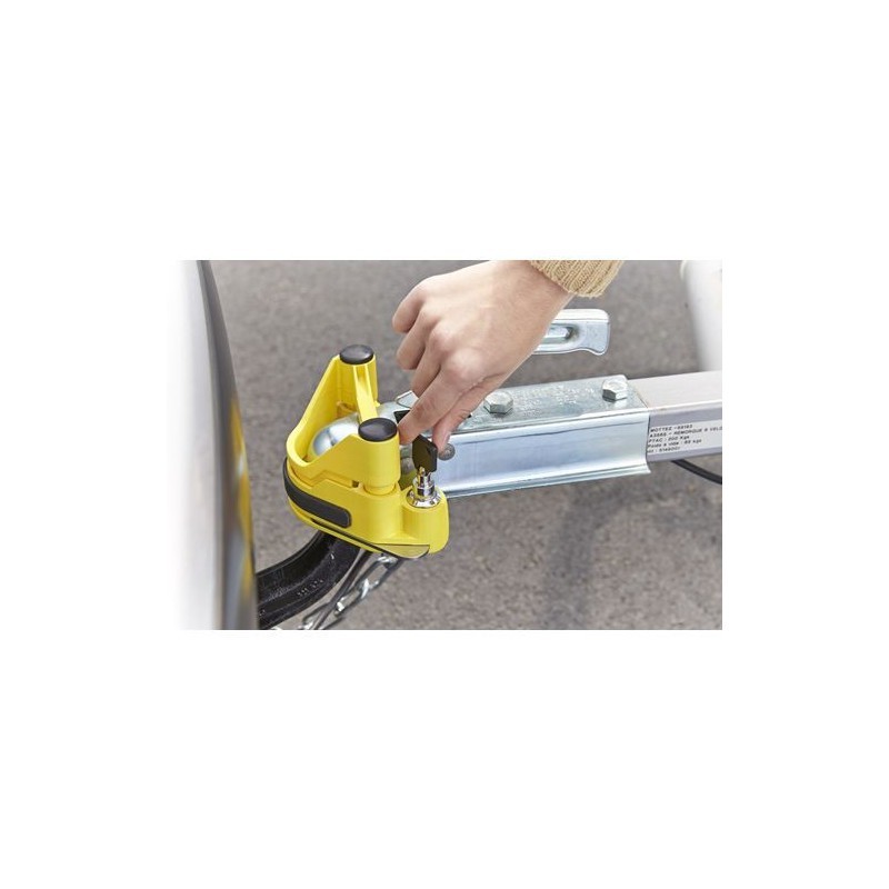 Antivol tête d'attelage permanent Permet de protéger la tête d'attelage seule ou fixée sur la boule du véhicule contre le vol Reste à demeure sur la tête d'attelage Verrouillage instantané avec serrure à poussoir Coloris jaune
