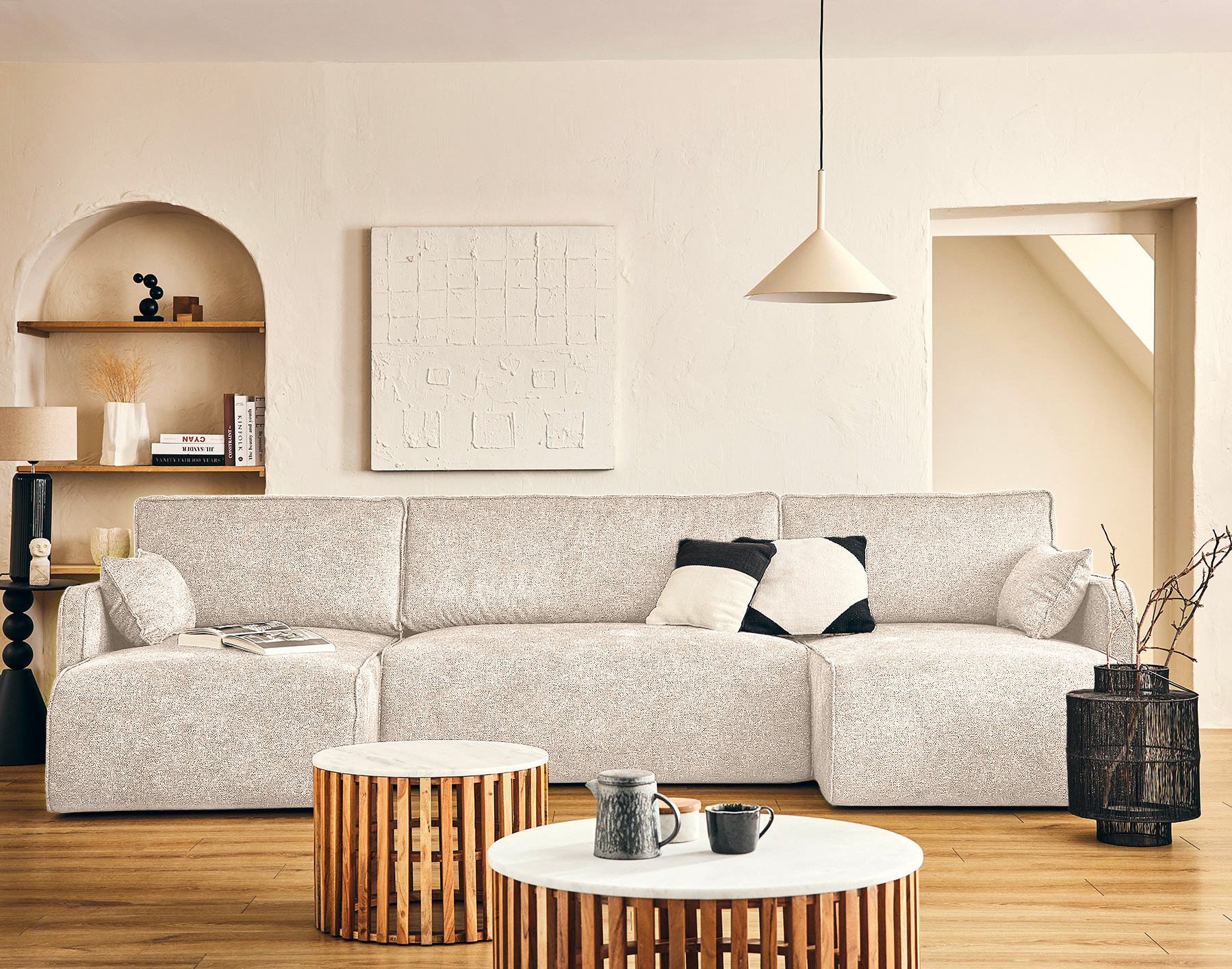 | Libellé | Apolline - canapé panoramique en U 7 places convertible avec coffres en tissu moucheté |