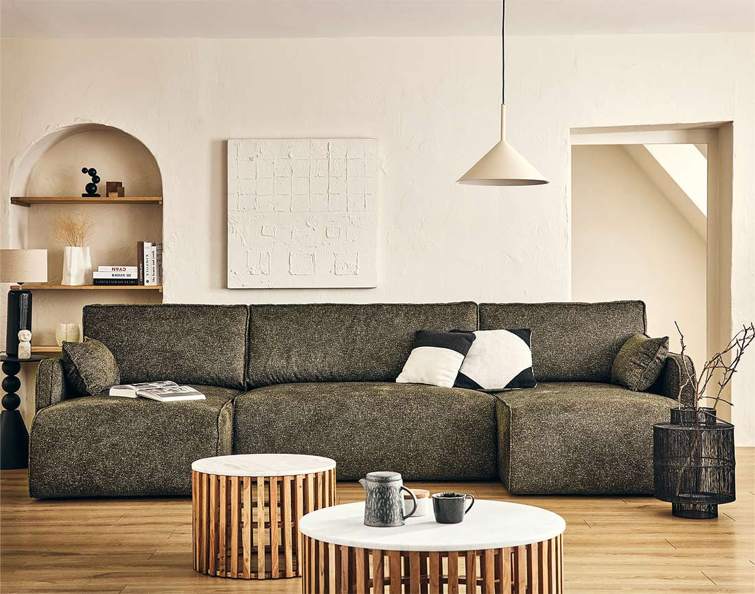 | Libellé | Apolline - canapé panoramique en U 7 places convertible avec coffres en tissu moucheté |