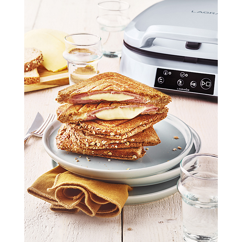 Générosité : permet de réaliser 4 croque-monsieur en moins de 3 minutes Ingénieux : avec sa carte électronique intégrée - au design Lagrange - il est très facile de suivre la cuisson des croque-monsieur. Voyants lumineux, signal sonore de fin de cuisson et ajout de temps supplémentaire sont intégrés pour une finition des croques parfaite. Pratique : poignée proéminente, clip de verrouillage, rangement vertical et range cordon intégré Facile à utiliser : plaques antiadhésives avec design Lagrange au motif à double étage pour sceller parfaitement les croque-monsieur
