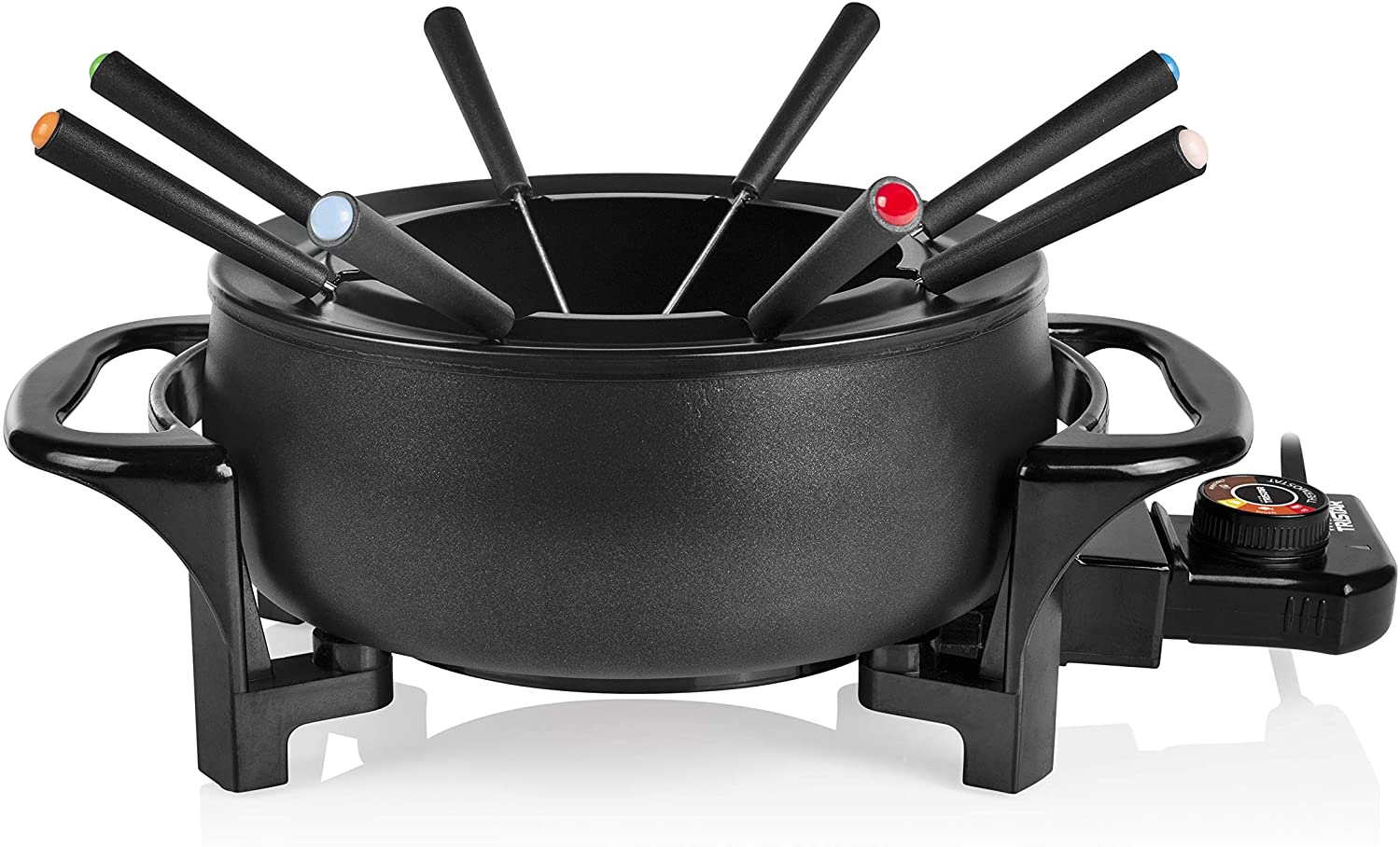 Vous aimez la fondue, mais vous détestez devoir utiliser les bougies chauffe-plats ? Optez alors pour l'appareil à fondue Tristar FO-1107. Le thermostat réglable est doté d’illustrations pratiques qui permettent de définir facilement la température optimale. Le caquelon à fondue luxueux, noir mat, est recouvert d’un revêtement antiadhésif pour un nettoyage facile. Grâce à son volume de 1,5 litre, le caquelon est adapté à 8 personnes maximum. Adapté aux fondues au chocolat et savoyarde L'appareil à fondue Tristar peut préparer le dîner et le dessert. Vous pouvez utiliser le service à fondue pour la traditionnelle fondue savoyarde ou plutôt une fondue sucrée et onctueuse au chocolat. Grâce à la puissance de 1 000 W, le contenu chauffe rapidement. Après avoir chauffé, vous pouvez régler facilement la température avec le thermostat réglable en le tournant sur l’illustration correspondante. L'appareil à fondue est fourni avec 8 fourchettes à fondue dotées d’un code couleur pour une reconnaissance facile. Facile à nettoyer Comme le caquelon a un revêtement antiadhésif de haute qualité, il est très facile de le nettoyer en tout temps. Vous pouvez laver les fourchettes au lave-vaisselle. La base de l’appareil à fondue peut être rincée et ensuite nettoyée avec un chiffon humide et doux. Facile comme bonjour. Contenu de l'emballage : Appareil à fondue Tristar, 8 fourchettes à fondue, mode d'emploi