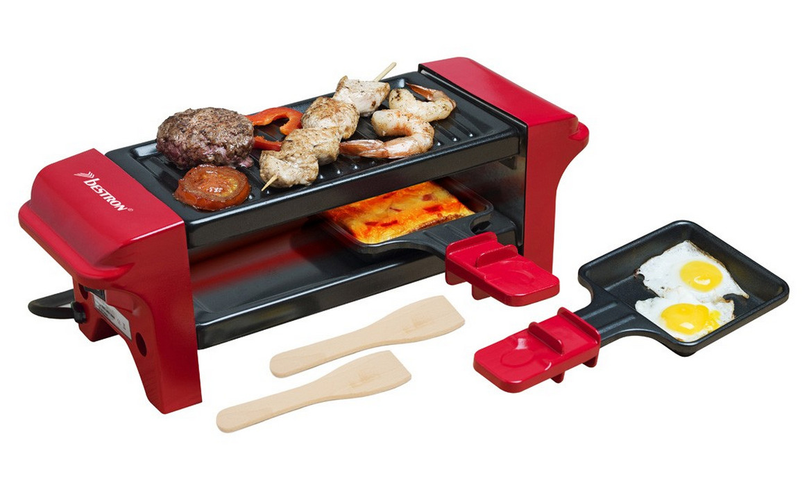 agr102 - appareil à raclette 2 personnes 350w + gril noir/rouge - Appareil à raclette gril Bestron AGR102 pour 2 personnes. Stabile boîtier résistant à la chaleur. Plaque de cuisson (20x10cm) avec revêtement antiadhésif. 2 poêlons avec revêtement antiadhésif. Interrupteur marche/arrêt. Facile à nettoyer. Avec 2 spatules en bois. Pieds antidérapants.