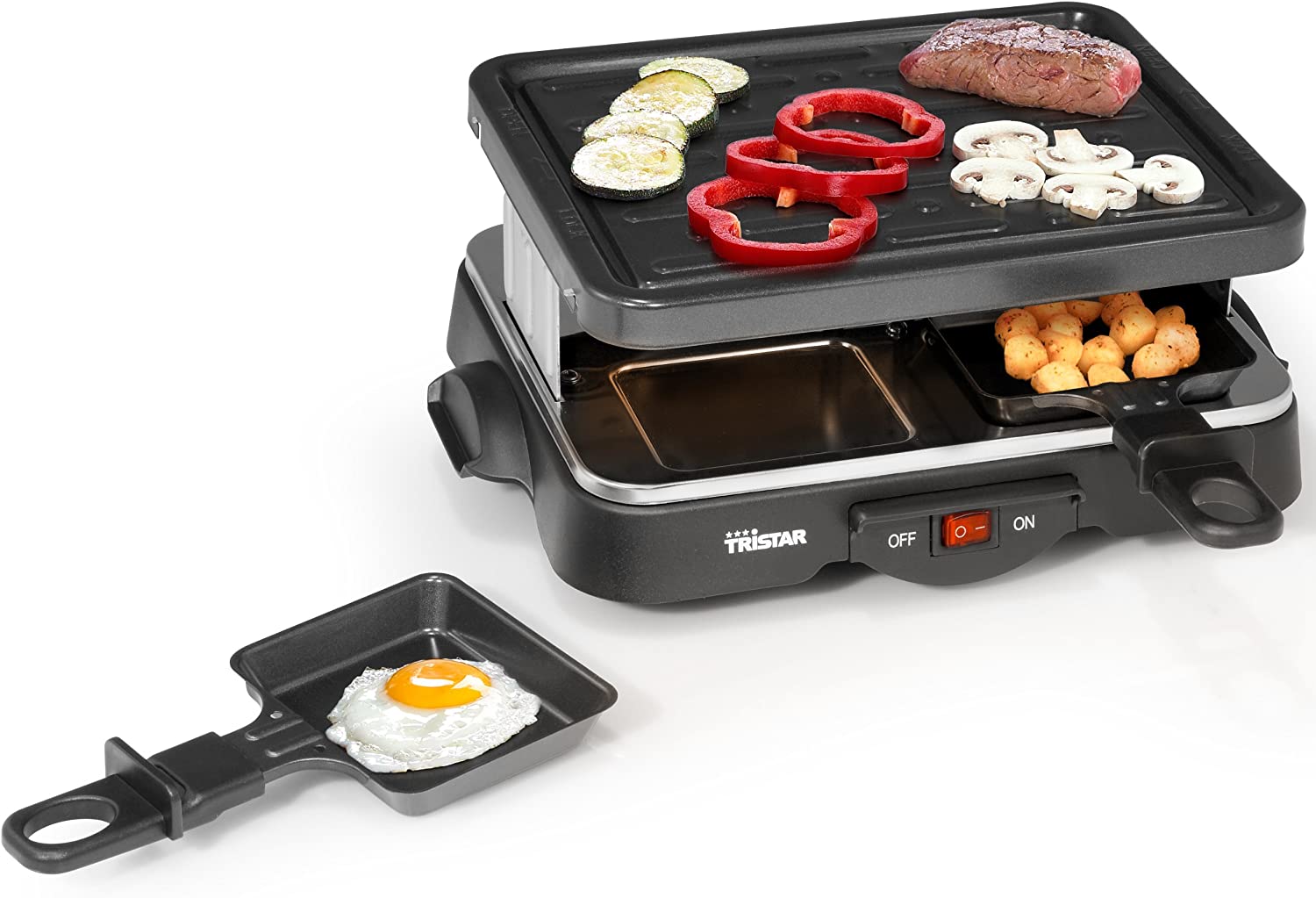 Le Tristar RA-2949 est un appareil à raclette pratique, compact et léger avec quatre coupelles et une plaque de gril. Grâce à sa taille compacte, il est par exemple très facile à emporter au camping ou à ranger après utilisation. Taille compacte L’appareil à raclette Tristar prend peu de place grâce à sa taille compacte. Le poids léger fait que vous pouvez également facilement l'emporter avec vous. La raclette a une puissance de 500 W. Cela rend aussi la pierre à cuire parfaite à utiliser au camping, afin d'avoir une belle soirée en famille et un bon dîner. Pour 4 personnes L’appareil à raclette Tristar est adapté pour quatre personnes. Il est muni d'une plaque de gril avec revêtement antiadhésif pour faciliter la cuisson et le nettoyage, ainsi rien n’attache à la plaque. La plaque de gril a une surface de cuisson de 22 x 17,5 cm. Sous le gril, vous pouvez disposer quatre coupelles également dotées d’un revêtement anti-adhésif. La forme carrée de la raclette fait qu’elle est facile à atteindre pour tout le monde. Pratique à l’utilisation L’appareil à raclette Tristar est très pratique à utiliser grâce à ses diverses fonctionnalités. Vous pouvez facilement le déplacer à l'aide des poignées intégrées, alors que les pieds antidérapants font qu’il est bien stable sur la table. Vous pouvez facilement le faire fonctionner avec l'interrupteur on/off, et le témoin lumineux vous indique en un coup d'œil si la raclette a atteint la bonne température. Contenu de l'emballage : Appareil à raclette Tristar, coupelles à pierre à cuire (4x), plaque de gril amovible, mode d’emploi Caractéristiques : Vous pouvez facilement ranger l’appareil à raclette après utilisation grâce à son poids léger Convient également au camping grâce à ses 500 W de puissance Avec quatre coupelles fournies, ce qui le rend approprié pour quatre personnes Plaque de gril amovible avec une surface de cuisson de 22 x 17,5 cm Très facile à utiliser au moyen de l'interrupteur on/off