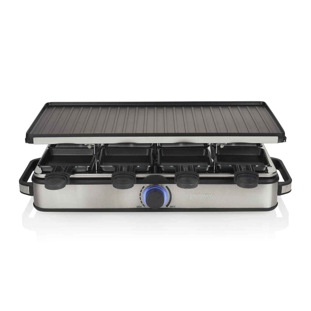 Cet appareil à raclette Princess Grill Deluxe 8 convient pour 8 personnes, il dispose d’un thermostat pour régler facilement la température. La plaque de grill est réversible avec un côté plat et un autre strié, l’ensemble présente un revêtement anti-adhésif. De quoi faciliter le nettoyage après utilisation. Cet appareil 4 en 1 est multifonctionnel grâce à ses plaques réversibles. Ainsi, vous pouvez choisir entre faire une raclette, faire griller et faire cuire ou tout à la fois ! Vous pouvez facilement régler la température grâce au thermostat allant jusqu'à 220 °C, ce qui le rend idéal pour cuire la viande, les poissons et tous types de légumes. La plaque chauffe rapidement grâce à son alimentation de 1400 watts. Les poignées « cool touch » des poêlons vous protègent des brûlures.