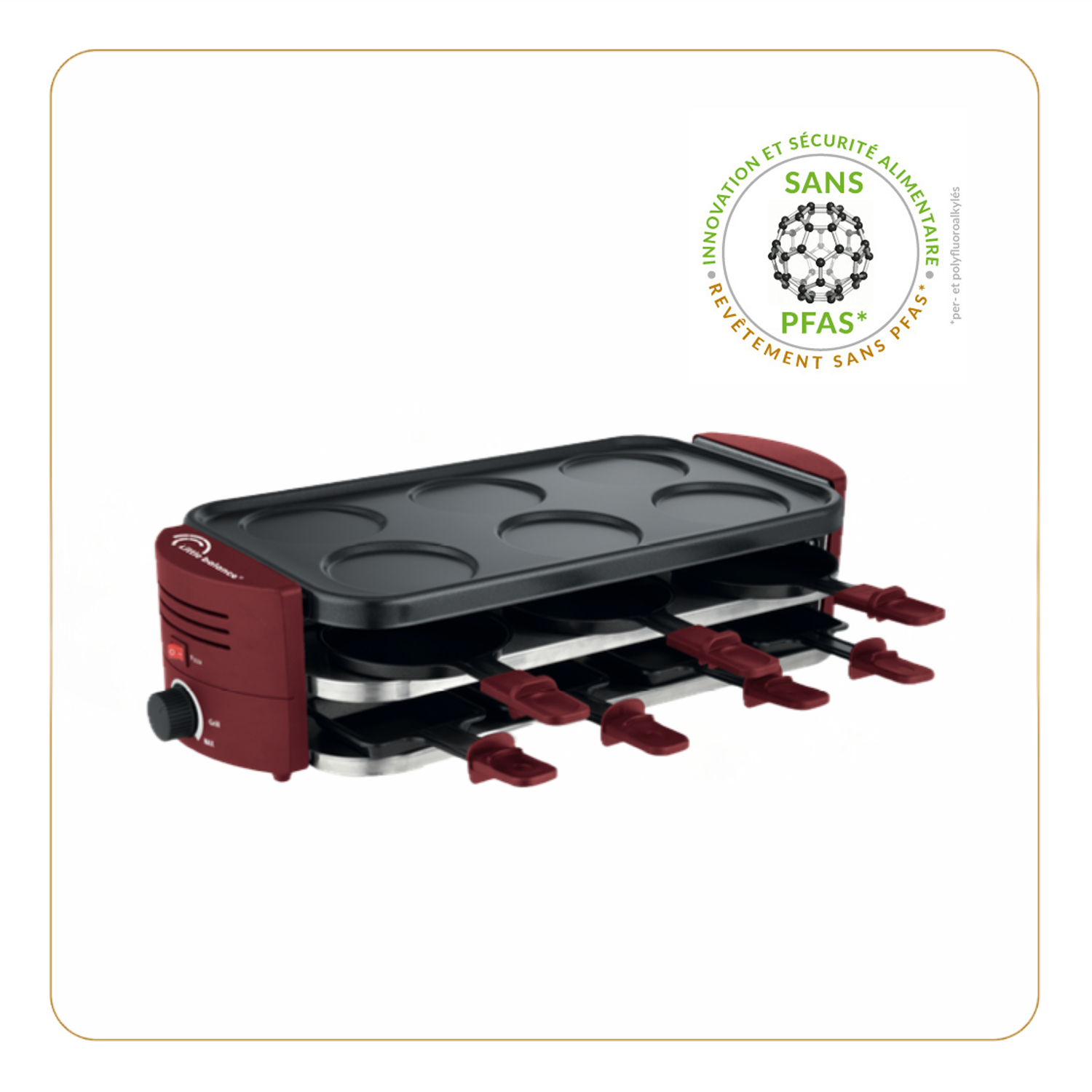 | Plus produit | Multifonction (raclette, mini-pizza, crêpes), plaque amovible, revêtement antiadhésif sans PFAS, 8 poêlons cool touch, poignées silicone détachables |